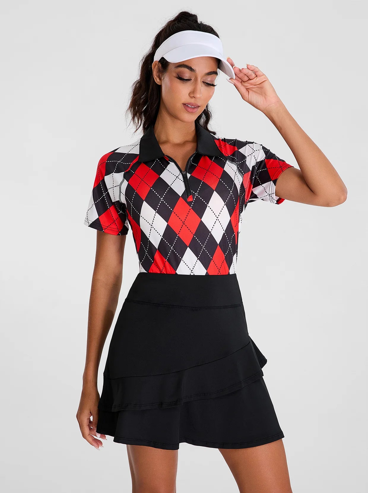 Swing your style with our checkerboard golf top! Crafted with breathable, moisture-wicking fabric, it keeps you feeling fresh and dry through every swing. Plus, its stretchy material and raglan sleeves ensure unrestricted movement, allowing you to focus solely on your game without any distractions!