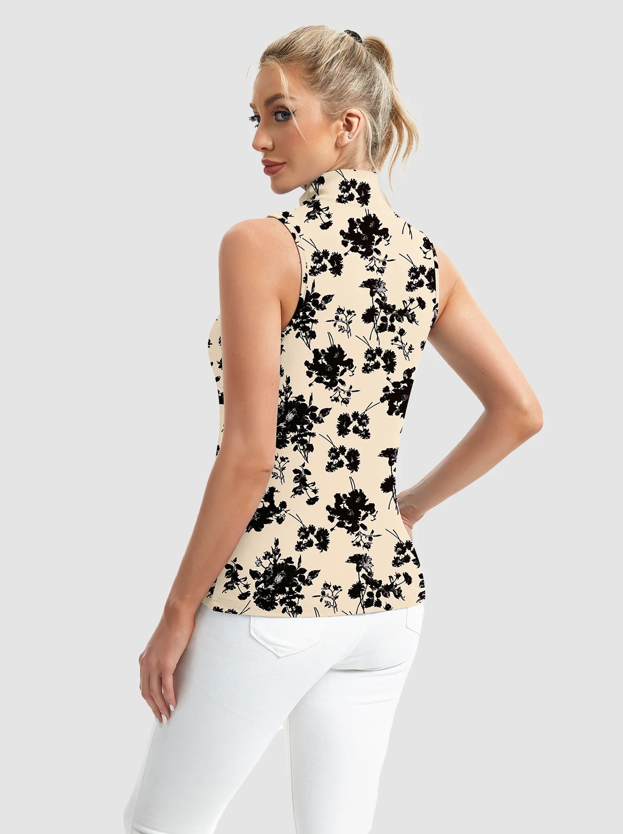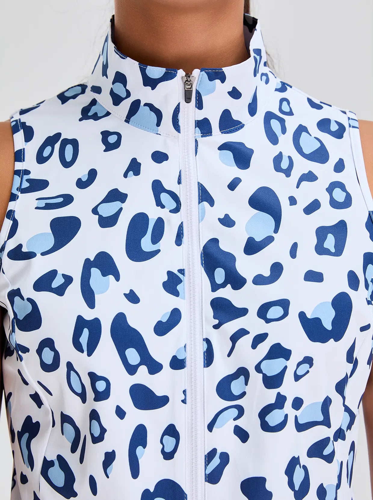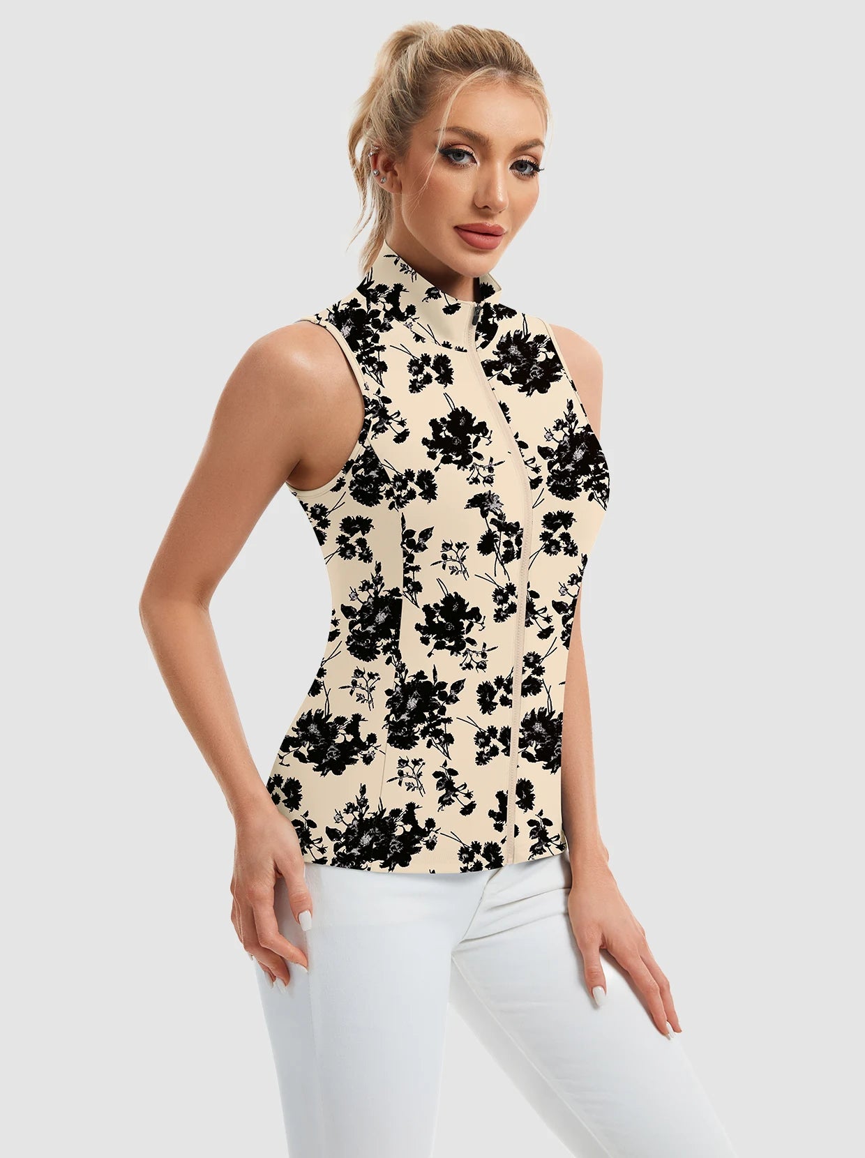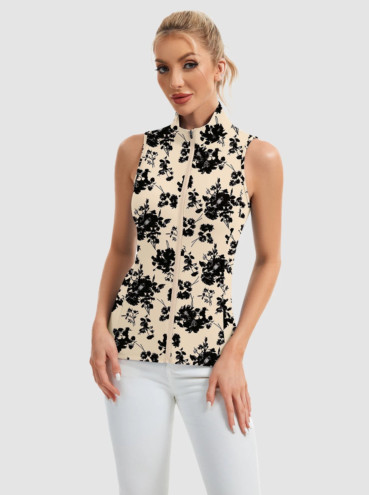 Unleash fierce style and peak performance with our printed Stand-collar Sleeveless Polo. The striking print and full-zip stand collar make a bold statement. Crafted from 4-way stretch, soft, moisture-wicking, breathable fabric, it ensures comfort and dryness. Its sleeveless design offers maximum movement for golf, tennis, pickleball, or turning heads daily. Elevate your active wardrobe with this daring, versatile piece!