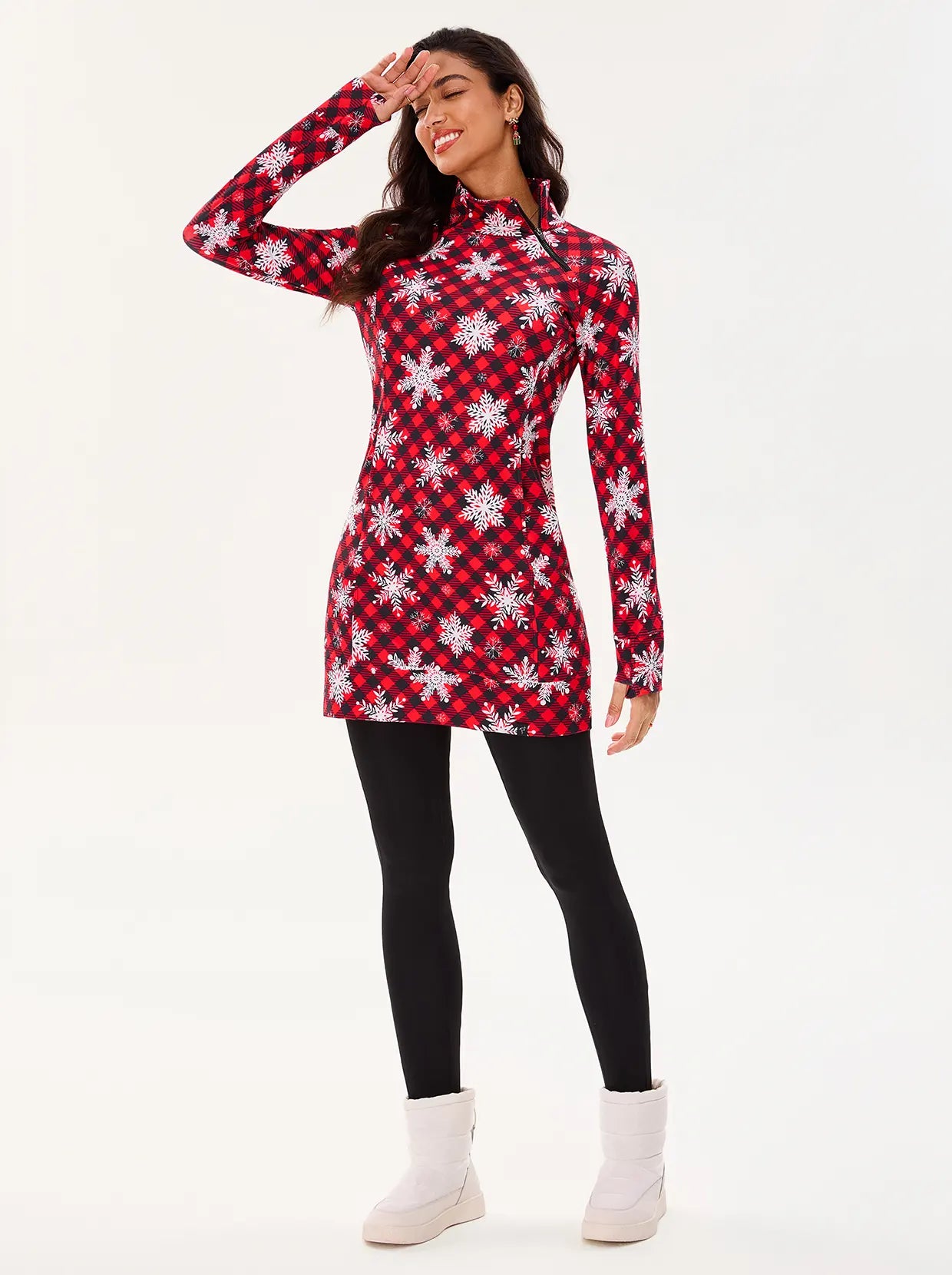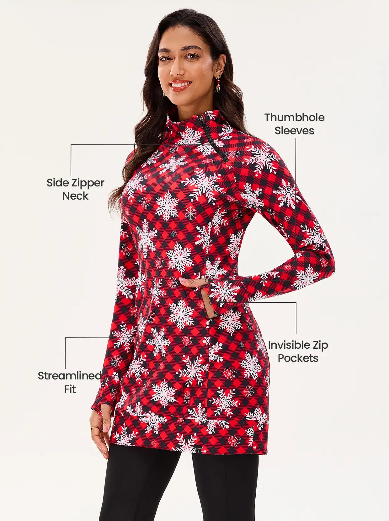 Wrap yourself in holiday cheer with our festive snowflake thermal dress! Designed for cozy winter days, it features a plush fleece lining that hugs you with warmth, while the stretchy fabric moves with you effortlessly. The clever side zipper lets you dial in your perfect fit, and thumbhole sleeves keep your hands toasty. Slip your hands into the roomy kangaroo pocket for extra coziness and storage.