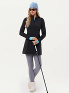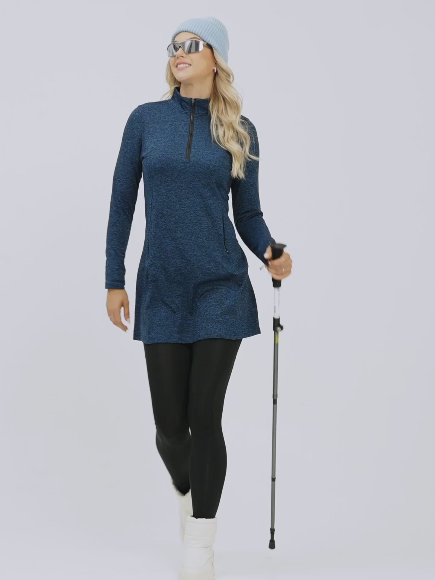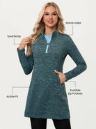 Stay warm and comfortable on all your outings with our Quarter-zip Long-sleeve Fleece Dress. The soft and stretchy warmth fabric, along with the stand collar and convenient pockets, make this dress perfect for any casual occasion. Choose from our selection of heathered colors in blue, green, pink, and black. You'll love the practicality and versatility of this dress for all your outings or casual wear needs.