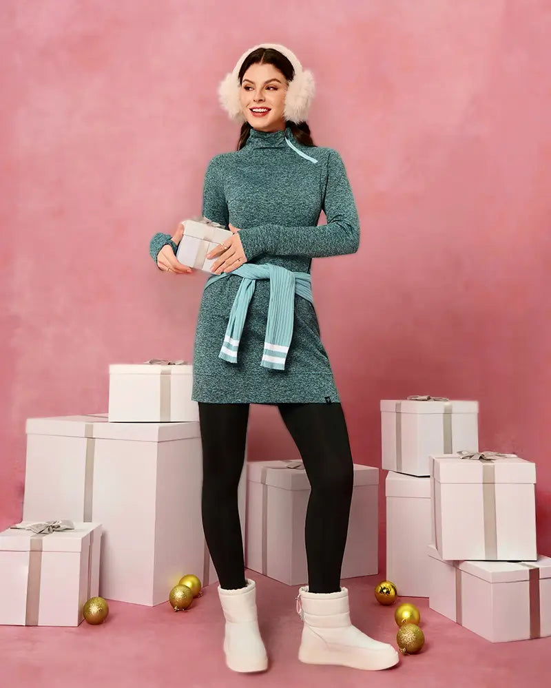 Side-zip 35" Mock Neck Long-sleeve Fleece Dress for Women