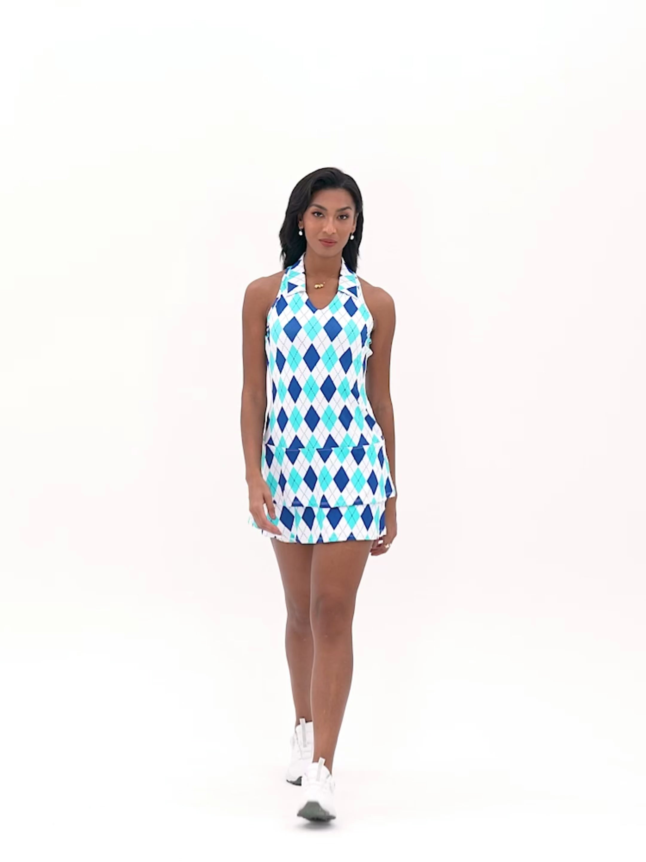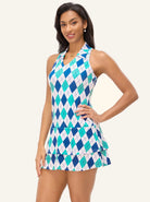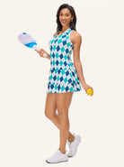 32" Blue and Green Checkerboard V-neck Racerback Sleeveless Dress