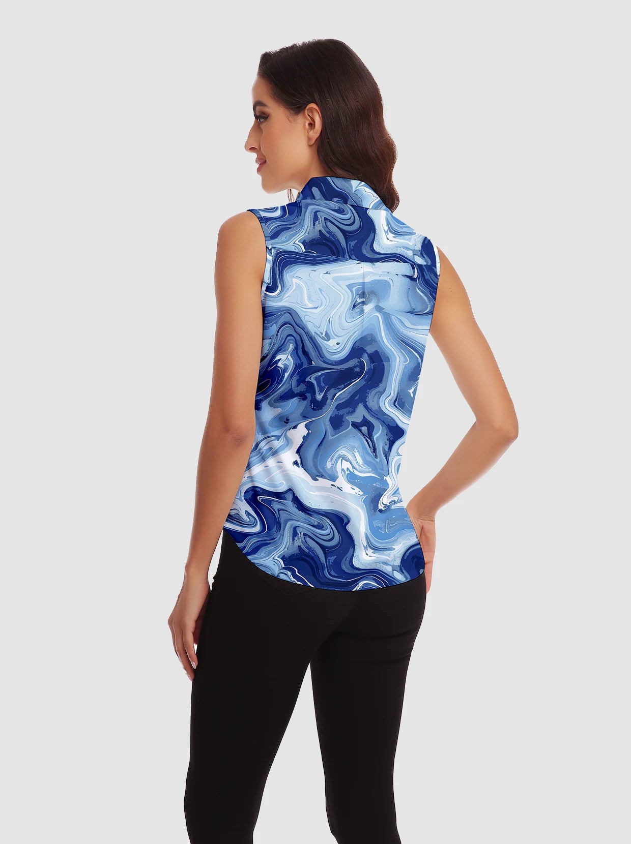 Elevate your active wardrobe with our blue abstract Sleeveless Polo, meticulously designed for performance and style. Experience ultimate comfort with its breathable, lightweight, and stretch fabric, allowing unrestricted movement during any activity. The incredibly soft texture feels amazing against your skin, while the flattering curved hem and classic button-down collar provide a sophisticated finish.
