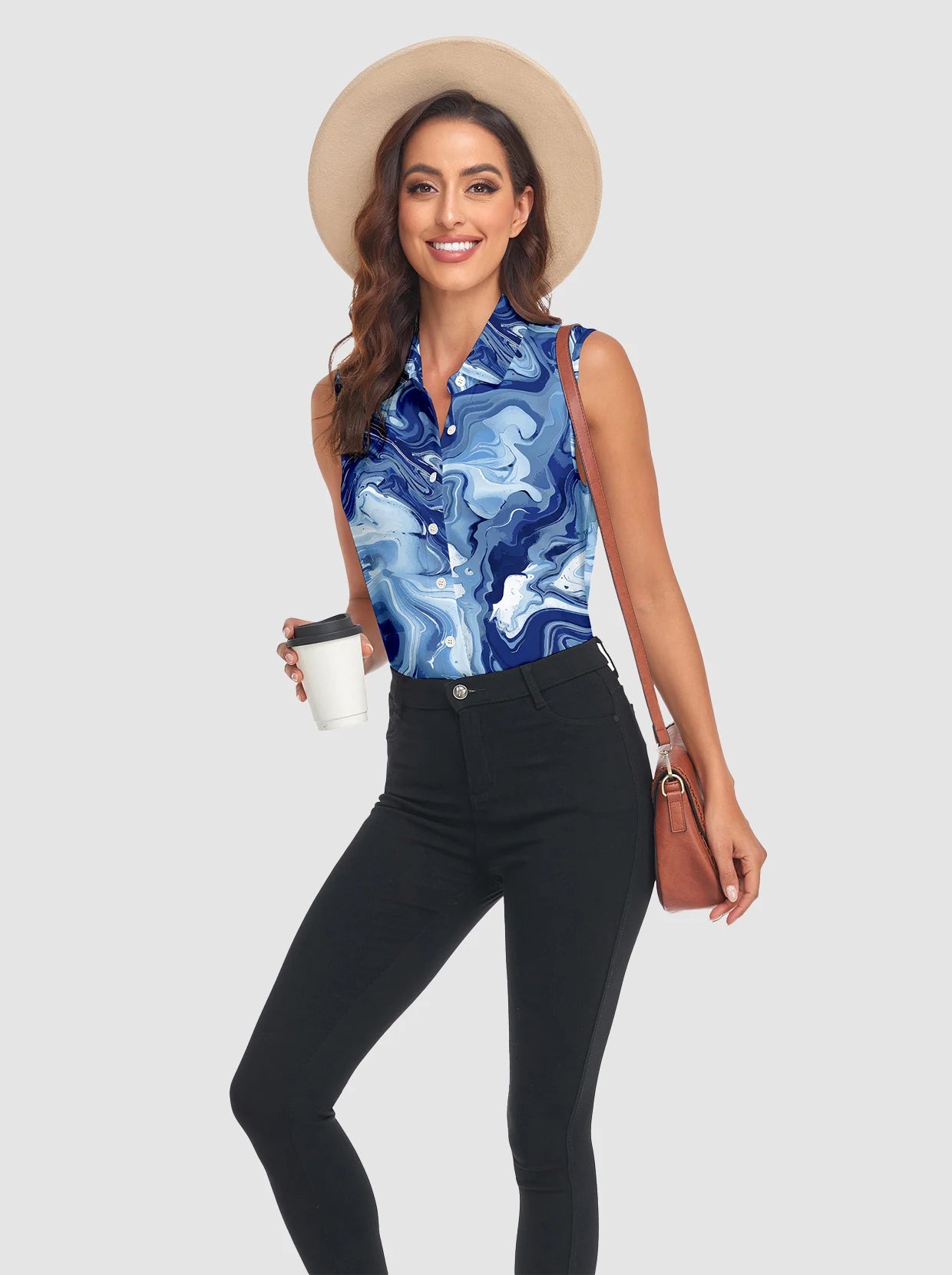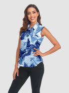Abstract Print Button-Down Sleeveless Polo Shirts For Women