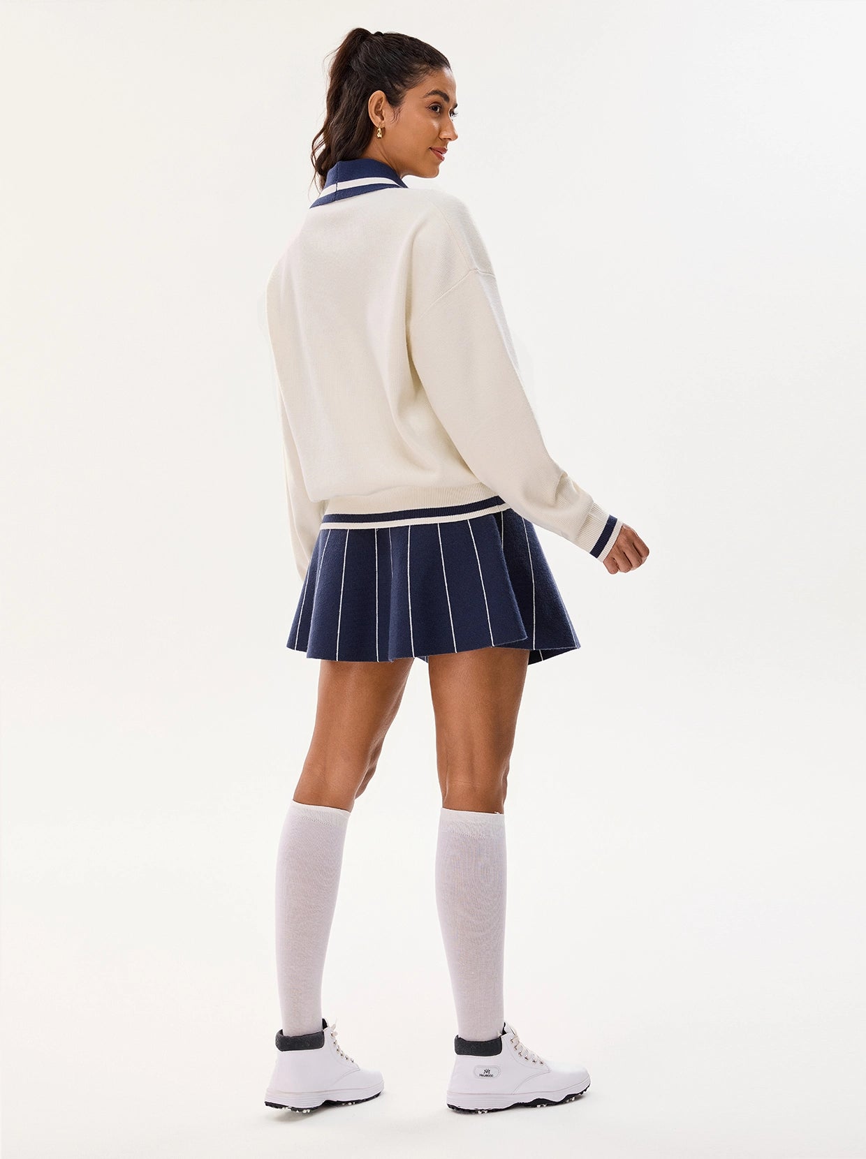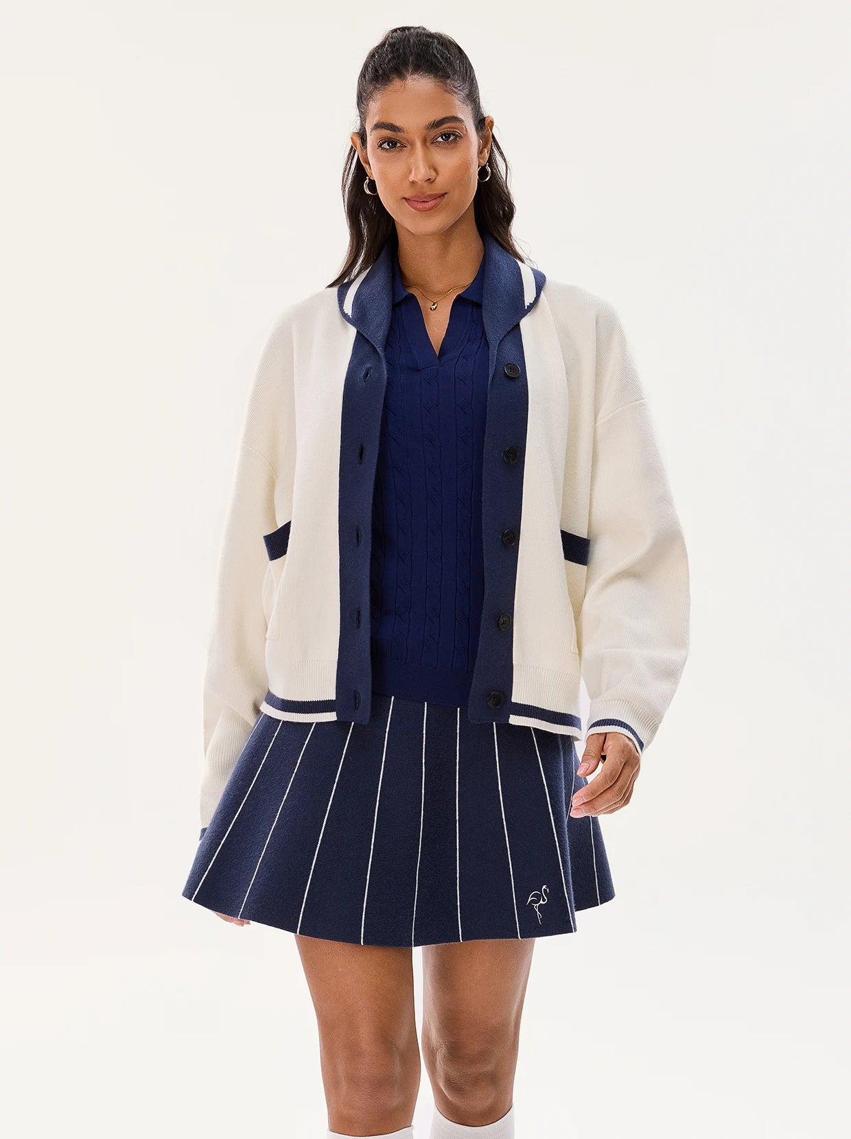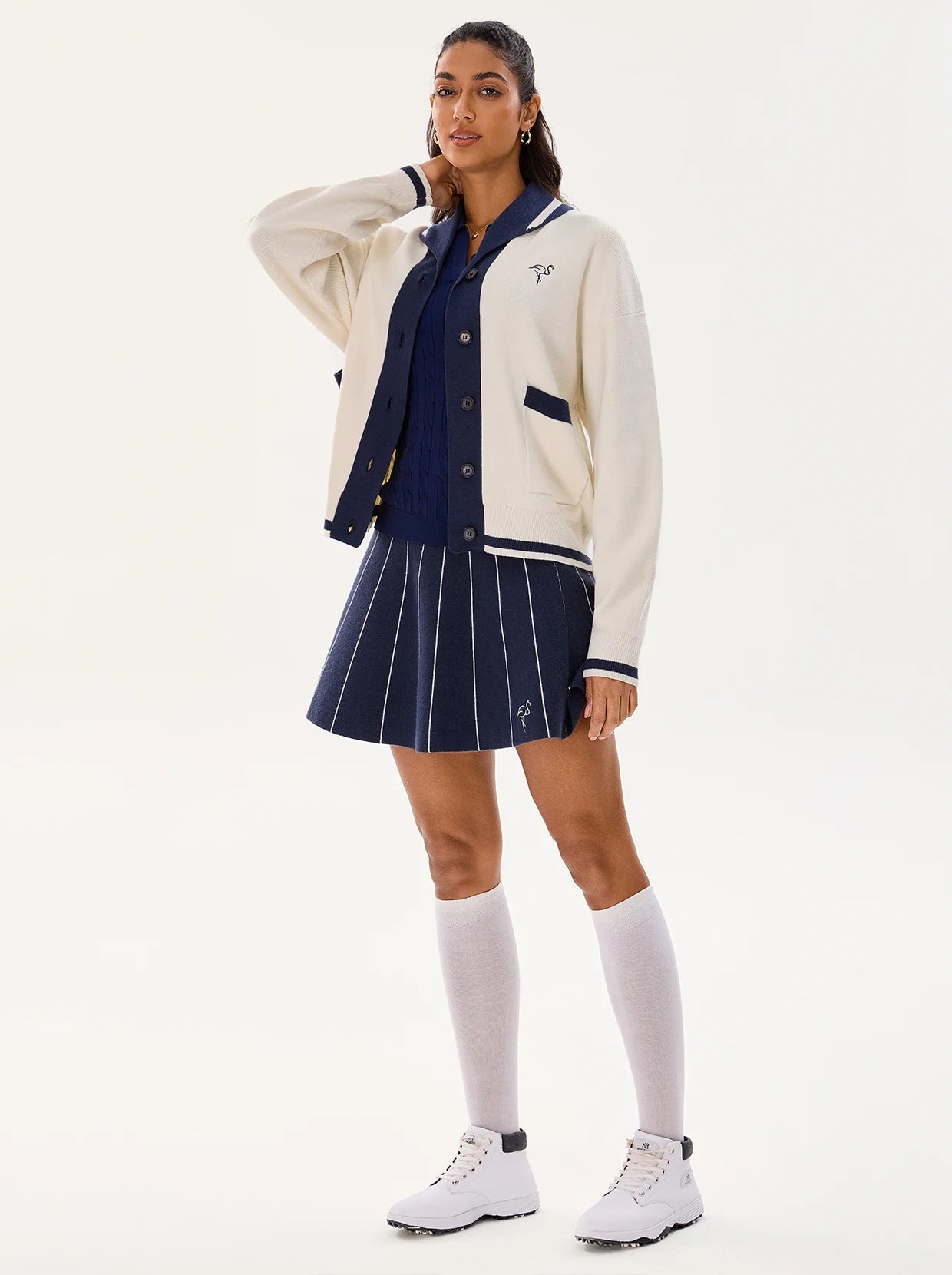 Layer up with this versatile V-neck cardigan that transitions seamlessly from the golf course to everyday adventures. The classic button-front design pairs timeless style with practical side pockets, while ribbed cuffs and hem keep everything in place. Crafted from a cozy blend of polyester, nylon, and acrylic, this blue and white color-blocked jacket delivers warmth without the bulk.