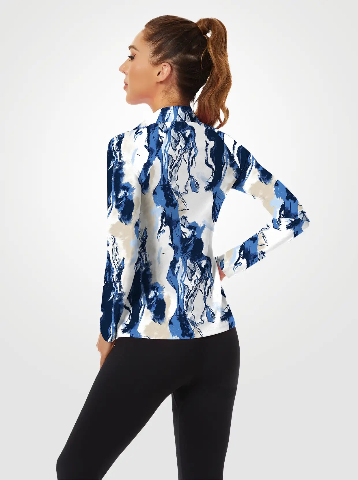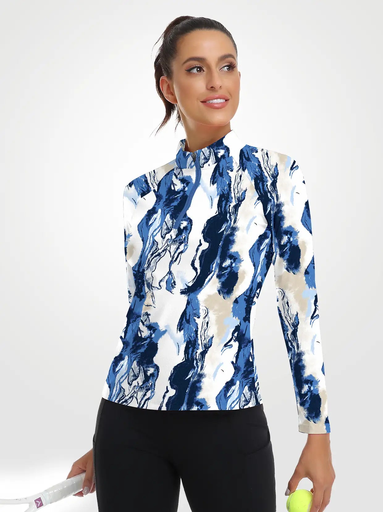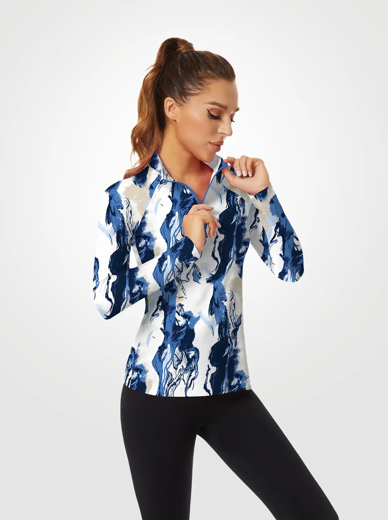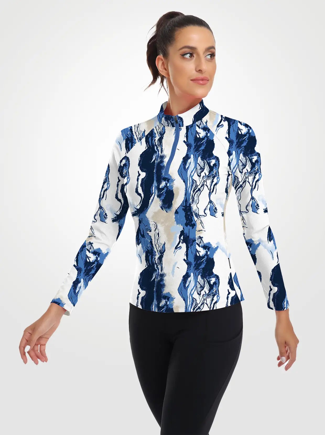 Blue and White Crack Quarter-zip Long-sleeve Shirt for Women