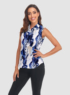 This blue crack pattern sleeveless polo is designed with your comfort in mind. The breathable fabric features 4-way stretch and moisture-wicking properties to keep you feeling fresh all day. With its flattering curved hem and classic button-down collar, it provides both style and functionality. Perfect support for your active lifestyle—from golf and tennis to pickleball or everyday errands.