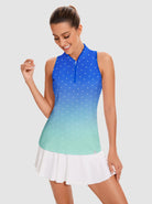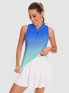 Play your best in our Blue Dot Gradient Quarter-zip Racerback Sleeveless Shirt. Featuring a stylish dot gradient print, this top is moisture-wicking, breathable, and offers comfortable 4-way stretch. The racerback and quarter-zip collarless design ensures freedom of movement. Perfect for golf, tennis, pickleball, or daily wear, it keeps you cool and confident.