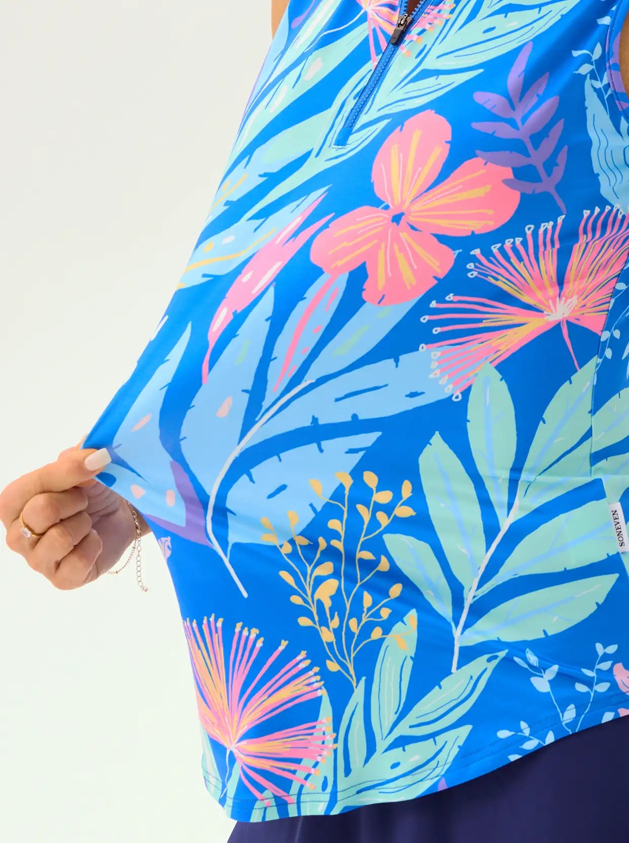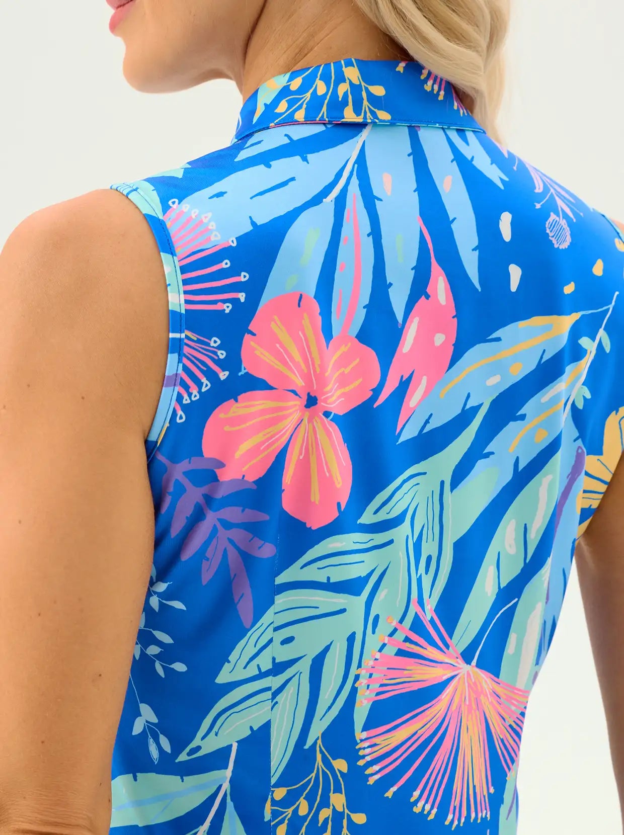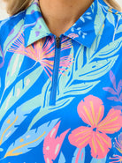 Stay stylish in the Blue Floral Quarter-zip Polo. Built for the peak of summer, this sleeveless top features UPF 50+ protection to block harmful UVA/UVB rays during long hours on the course or court. The quarter-zip collar allows you to customize your airflow as the game heats up. Lightweight and breathable, it’s the perfect high-performance essential for golf, tennis, or pickleball.