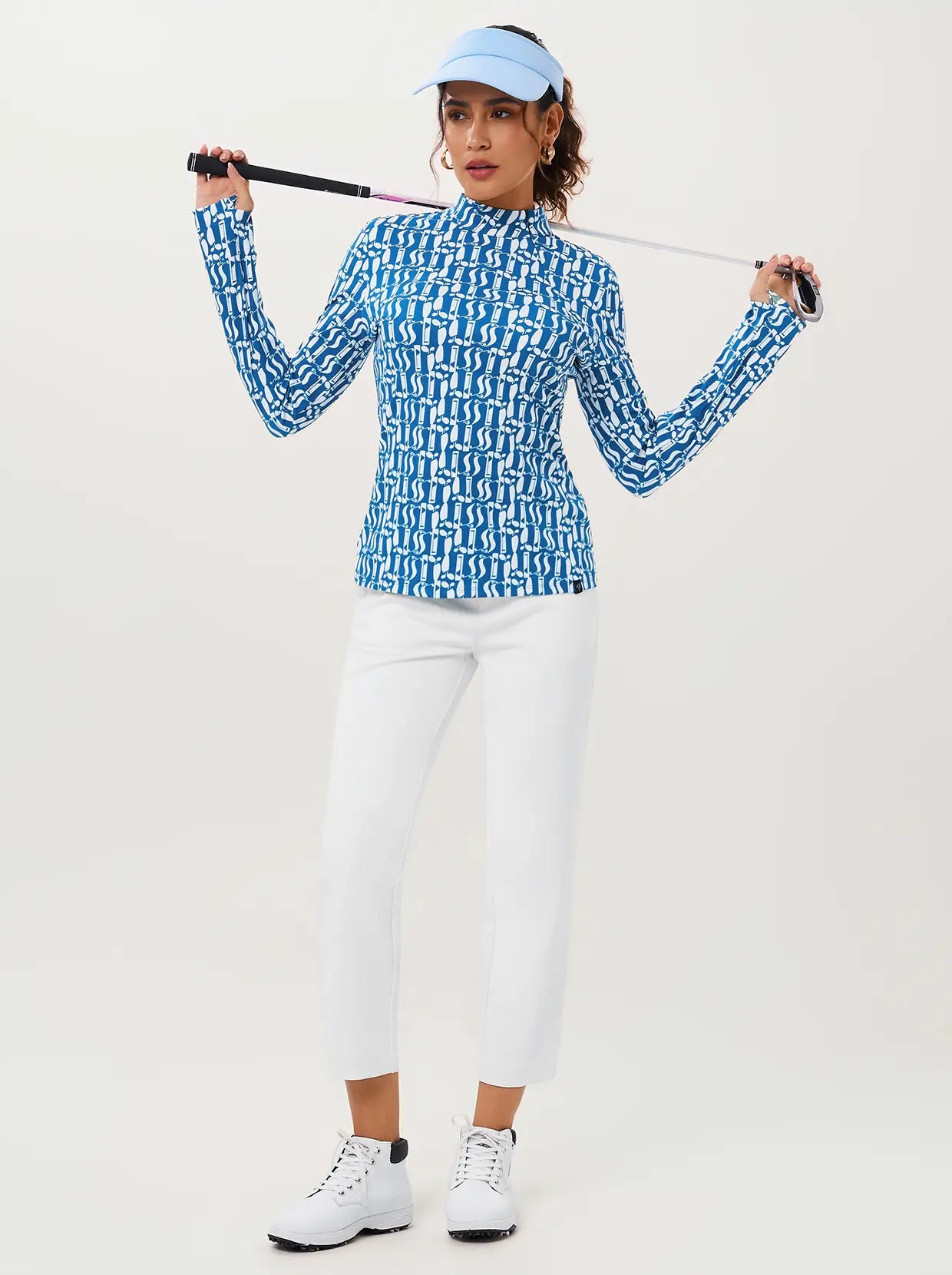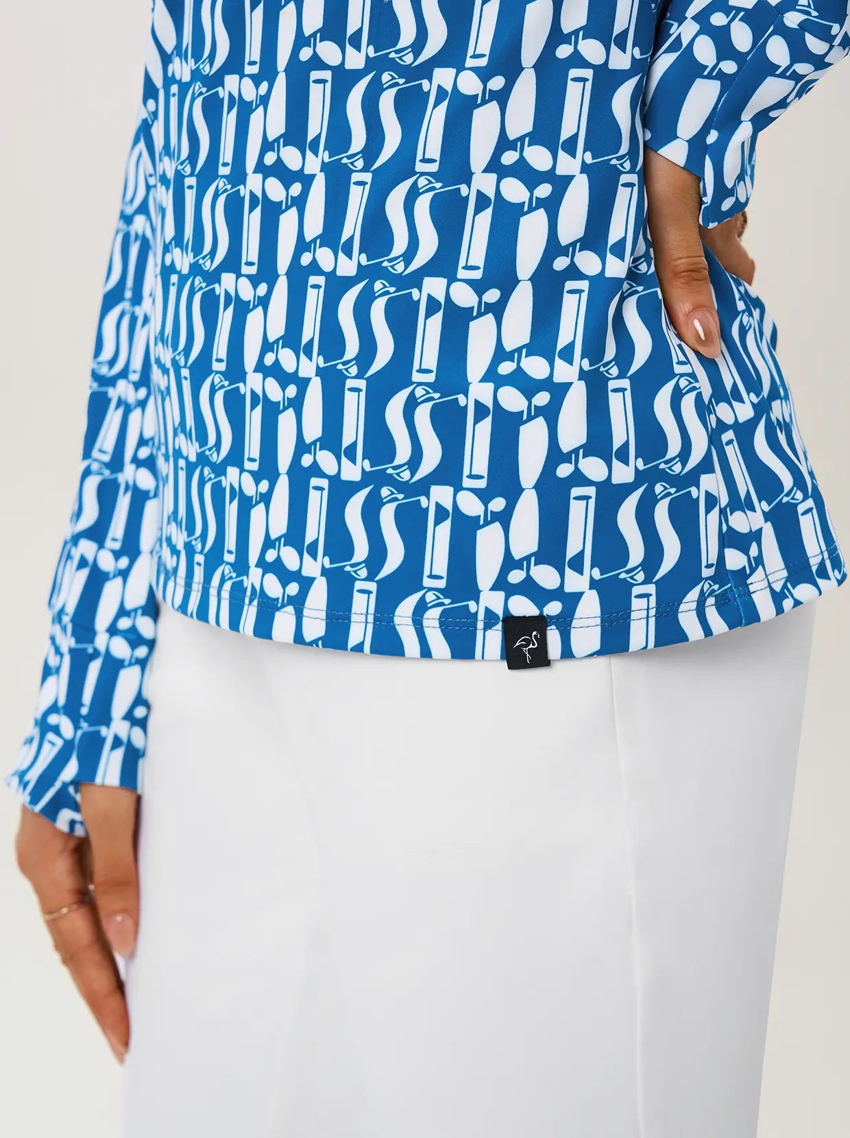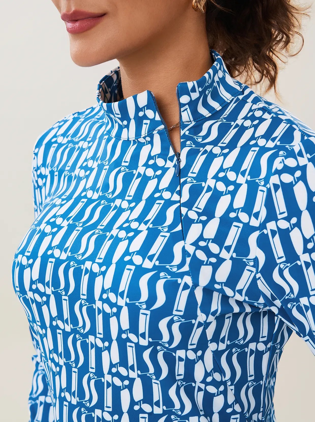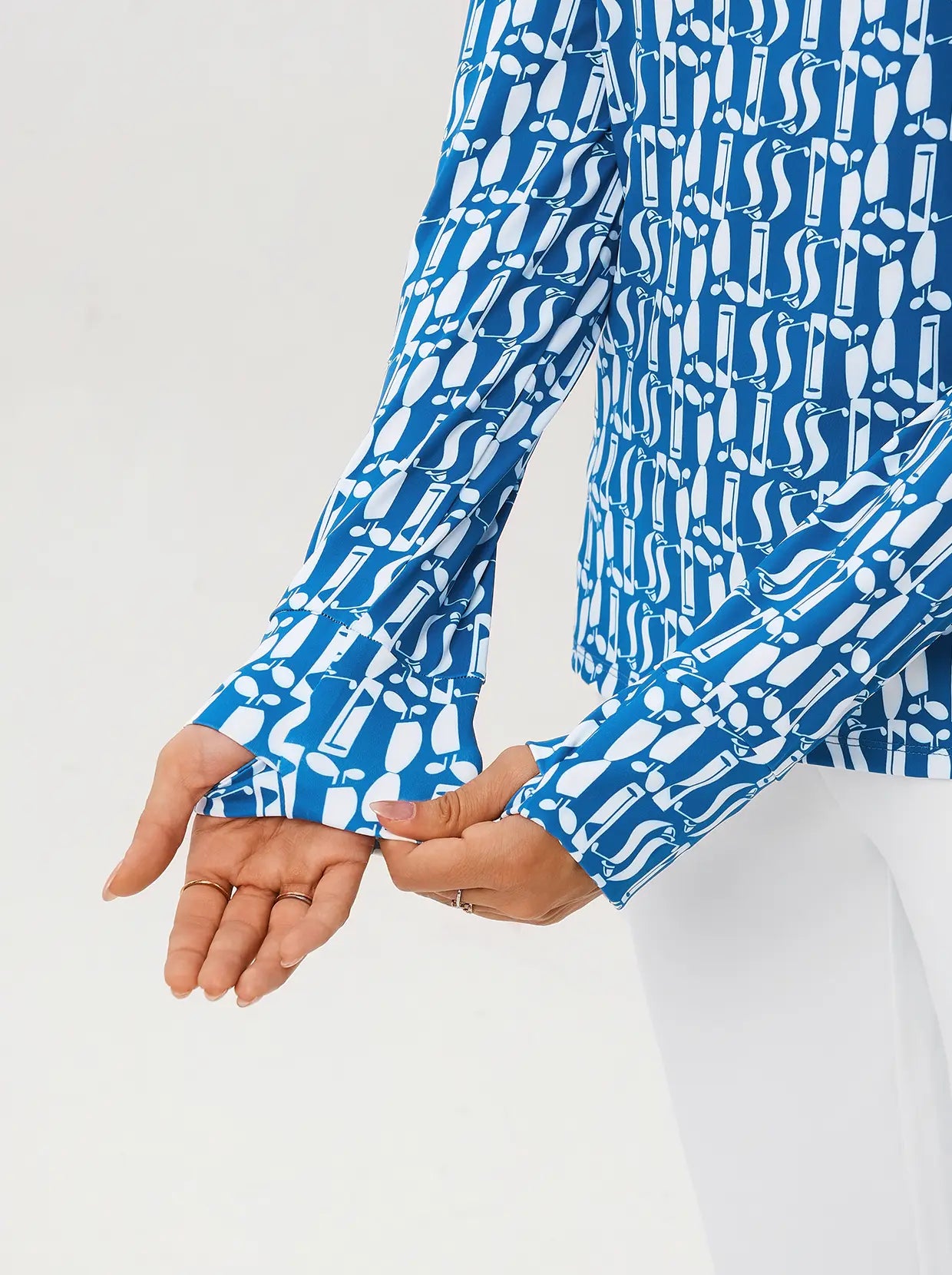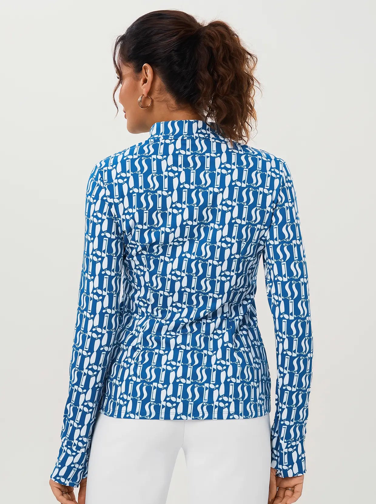A modern statement from our Fall for Classics Collection, this long-sleeve shirt features a white geometric print for a clean look. The 4-way stretch fabric provides complete freedom of movement, while a side zipper and stand collar offer a sleek, customizable fit. Complete with functional thumbholes for extra warmth, it's perfect for effortless style during seasonal transitions.