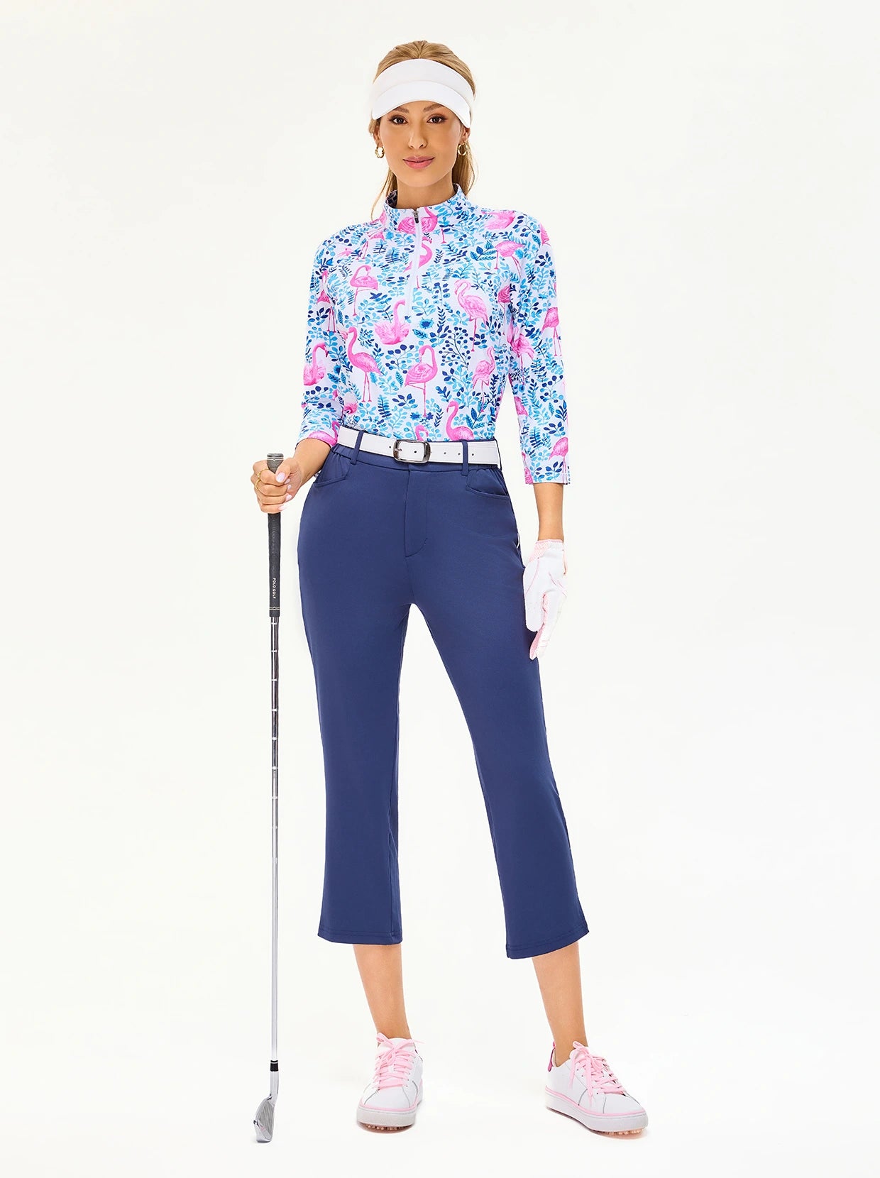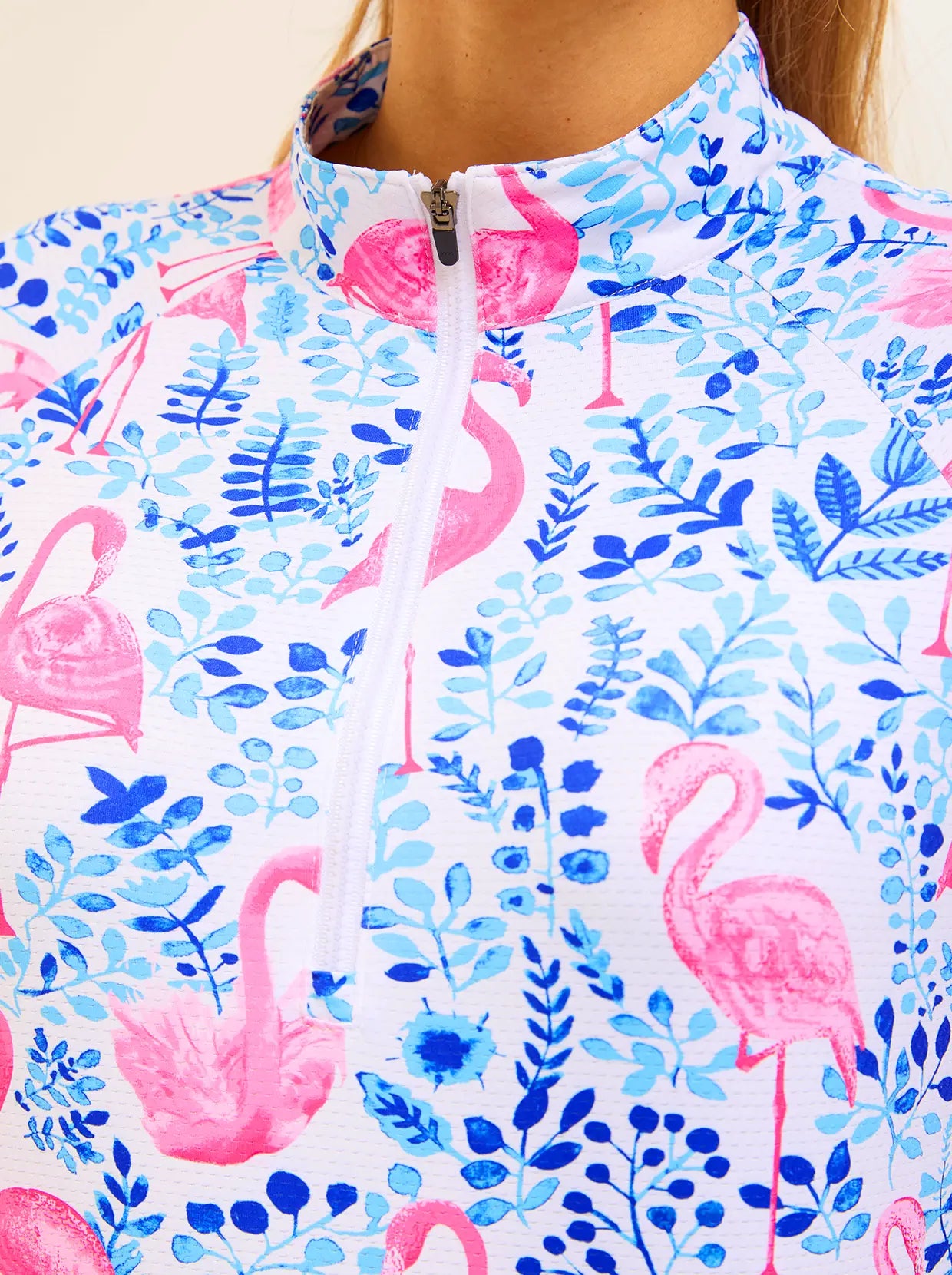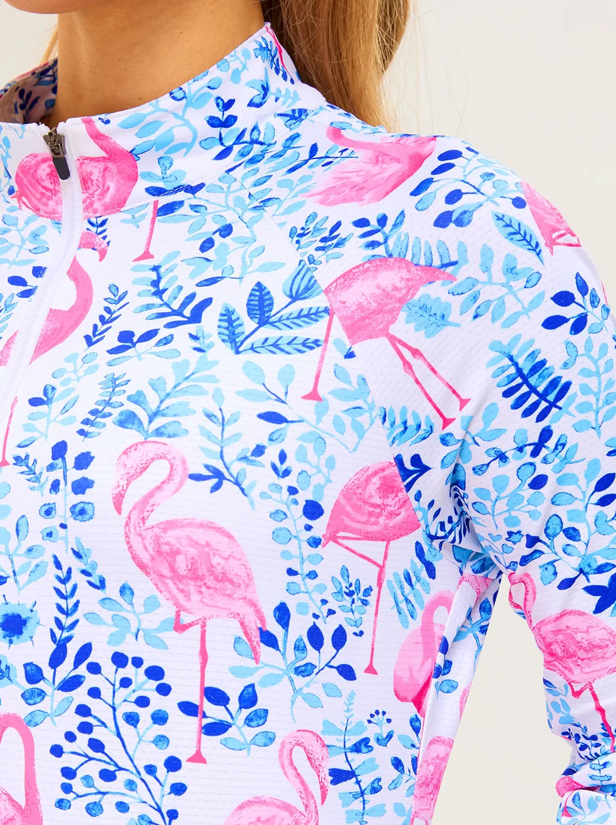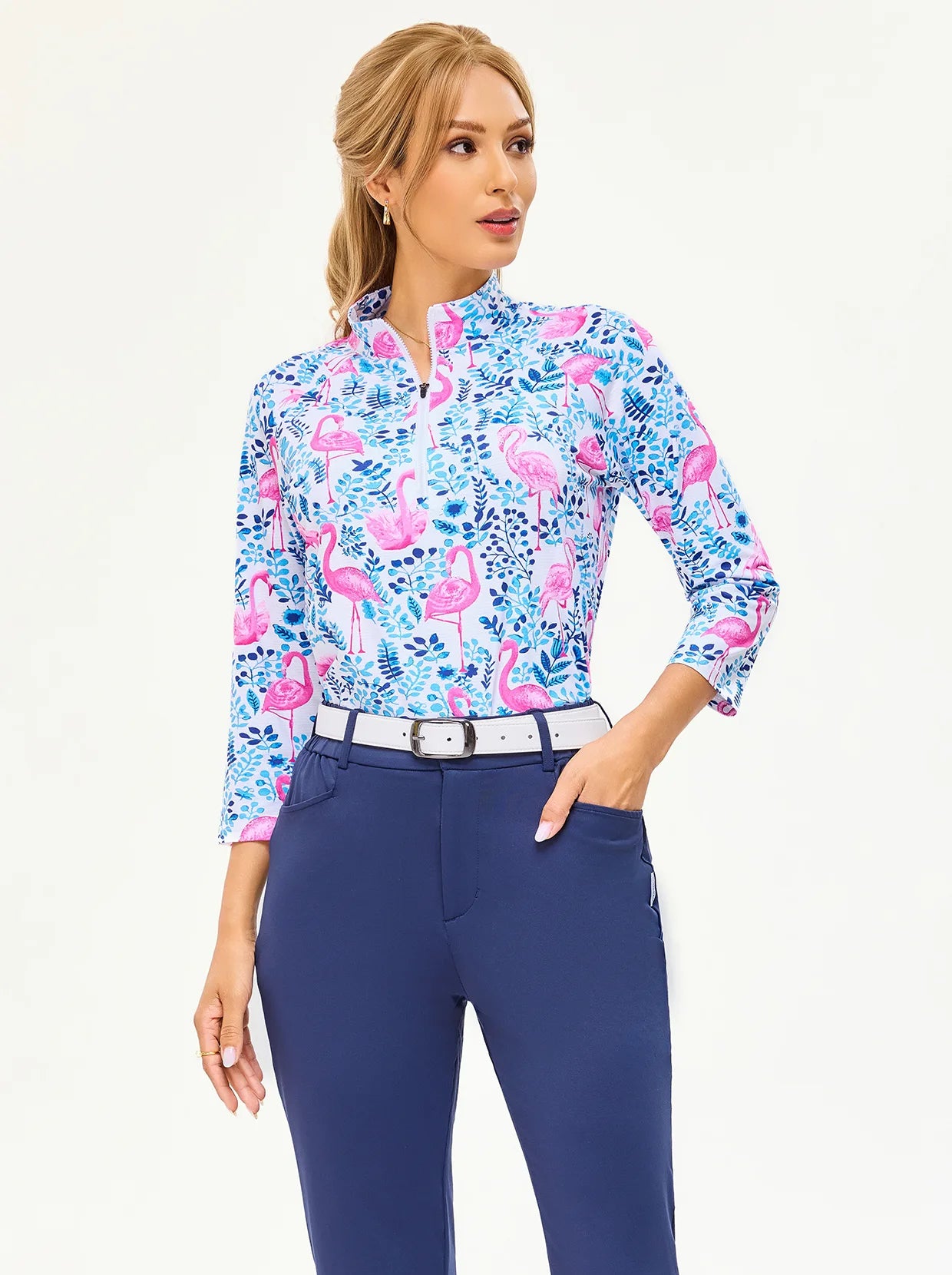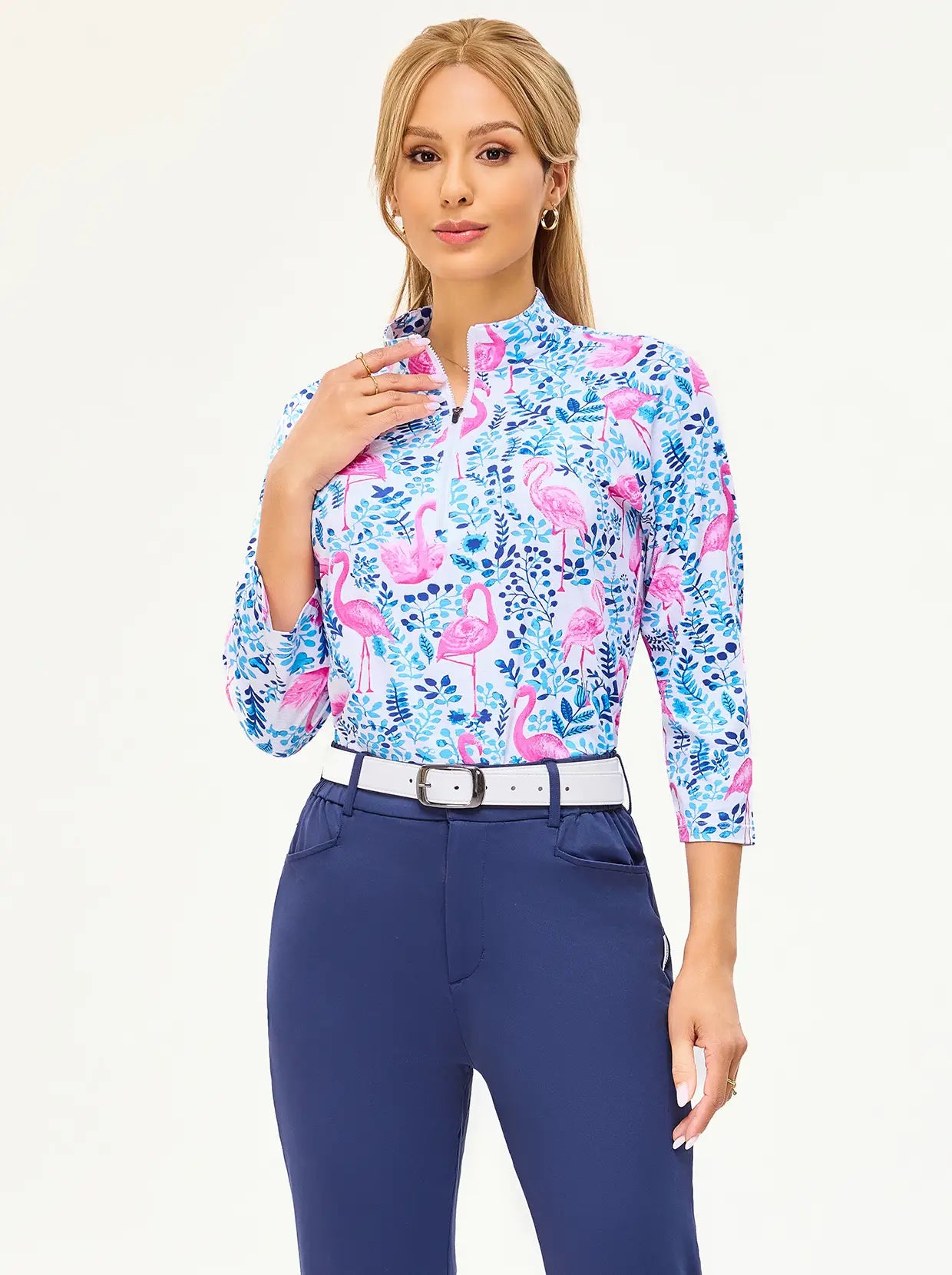 Swing in style with our Flamingo Print Athletic Shirt. This quarter-zip, 3/4 sleeve top combines style and function. Crafted from soft, breathable, and moisture-wicking fabric, it offers ultimate comfort during workouts. The 4-way stretch and flattering raglan sleeves ensure unrestricted movement.