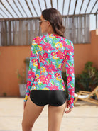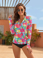 Floral Quarter-zip Long-sleeve Rash Guard with Thumbholes