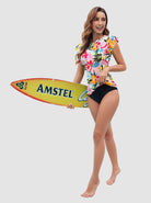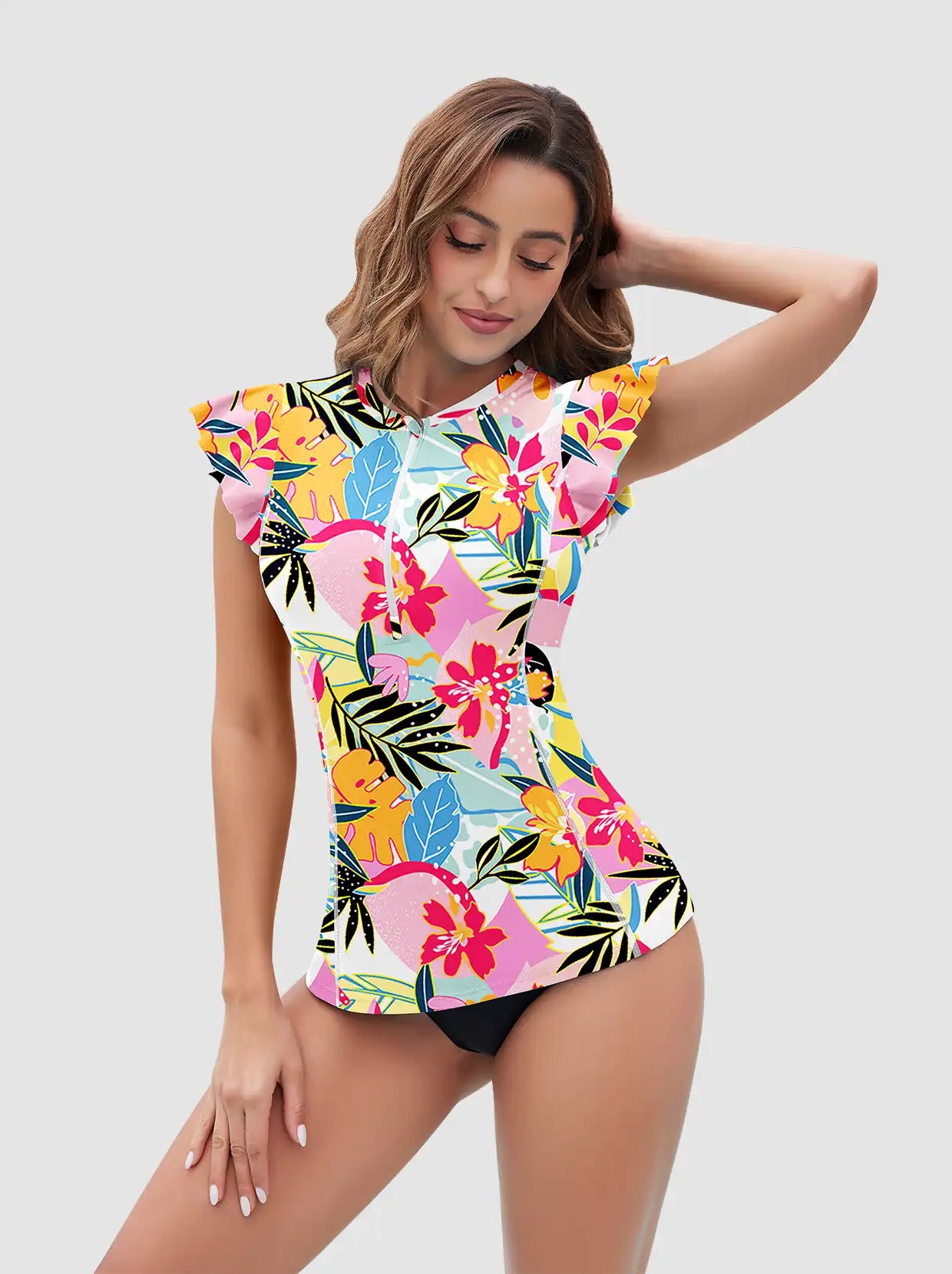 Elevate your aquatic wardrobe with our Floral Ruffled Sleeveless Rash Guard. This quarter-zip piece offers UPF 50+ protection, a streamlined silhouette with built-in bra support, and elegant ruffled details. The quarter-zip design and 4-way stretch fabric ensure comfort and mobility, while moisture-wicking properties keep you dry during beach outings, surfing adventures, or outdoor gatherings.