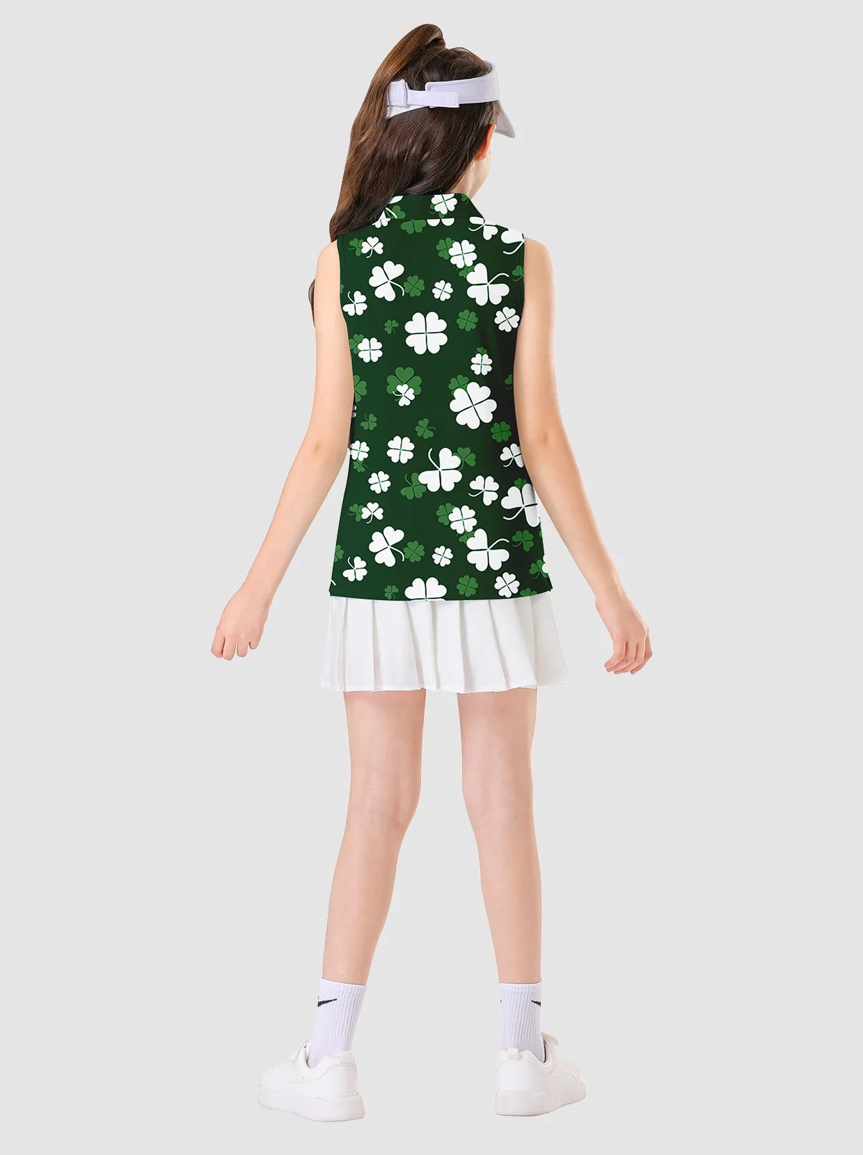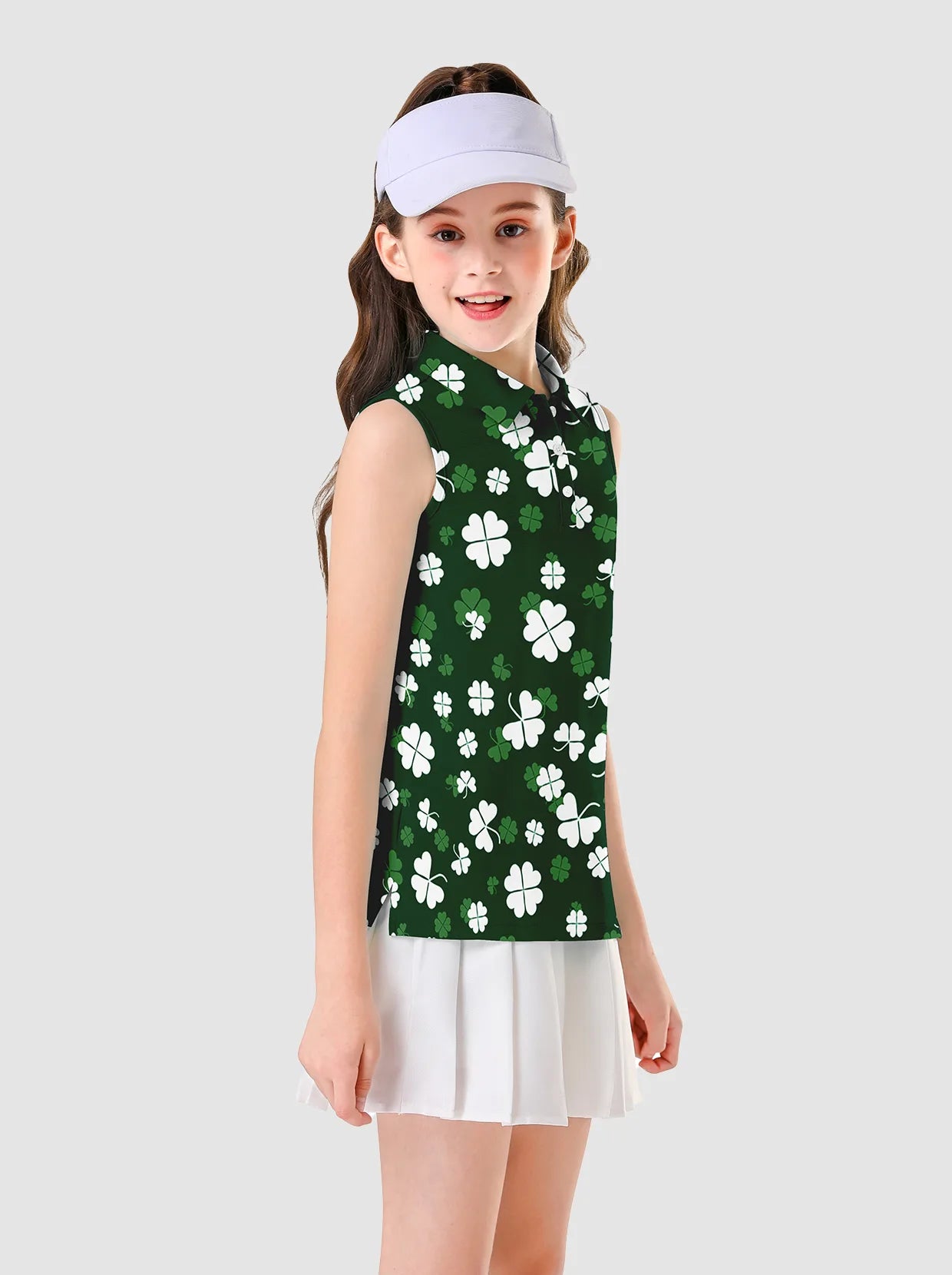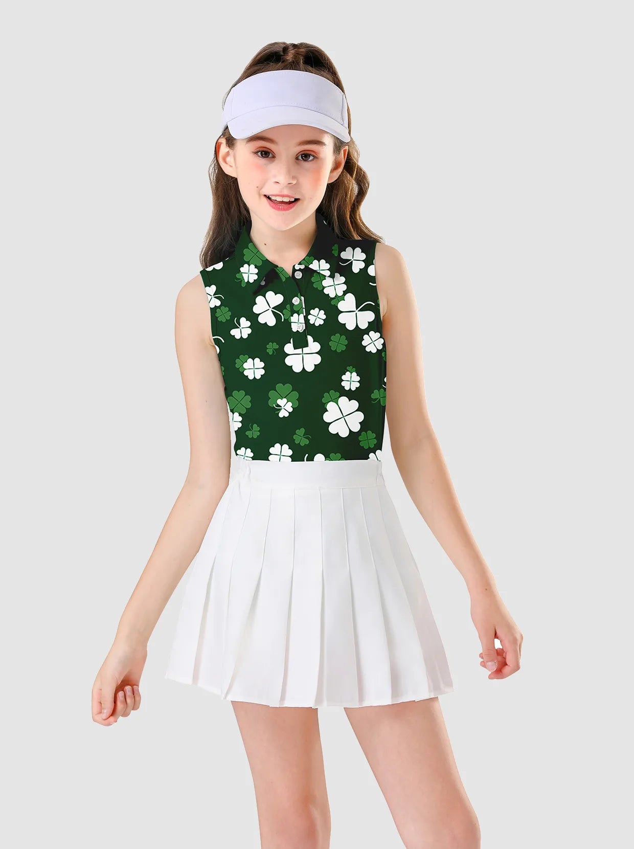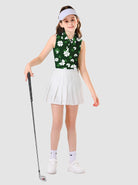 Green Shamrock Button-placket Sleeveless Polo Shirt For Girls