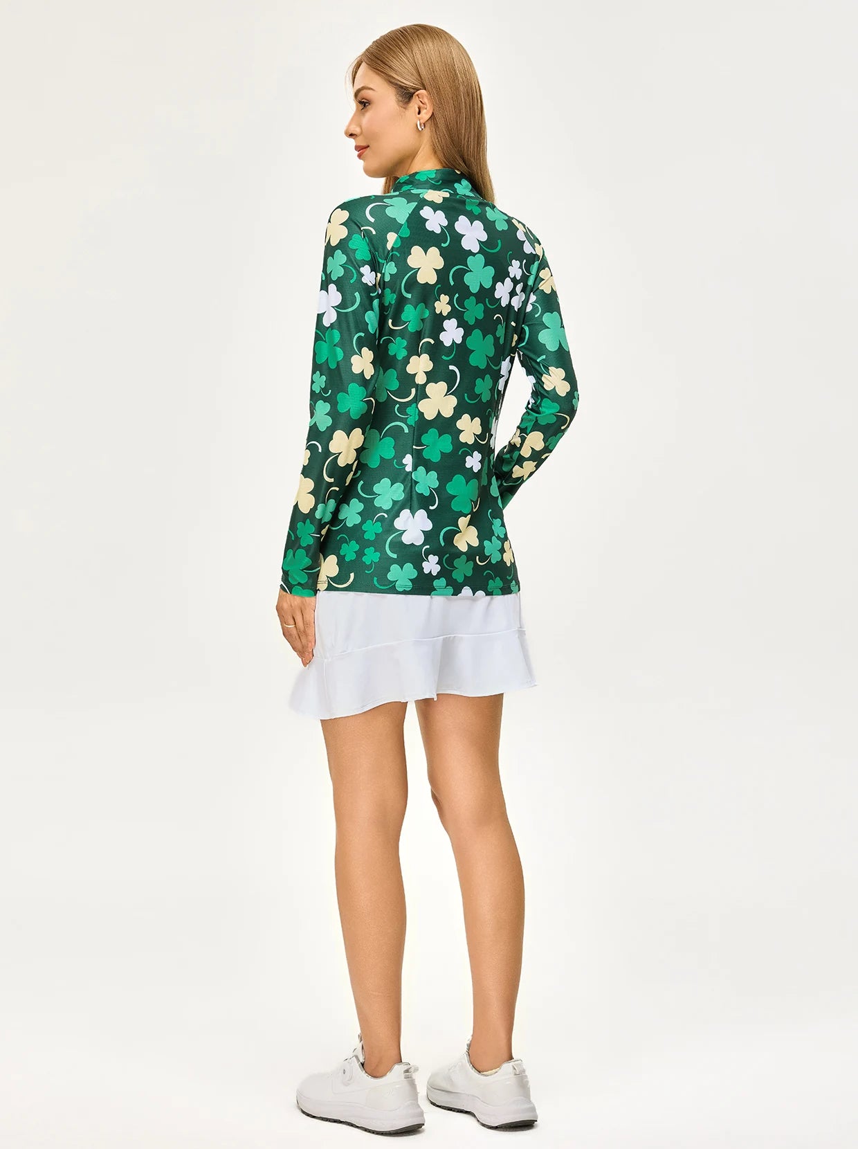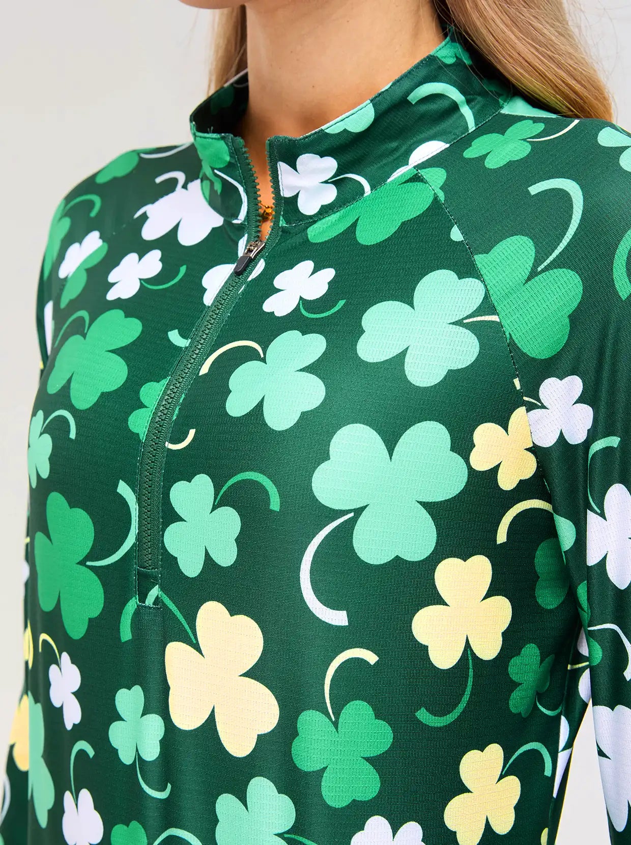 Rock the luck of the Irish in this cheerful green shamrock shirt. Built with moisture-wicking, breathable fabric to keep you feeling fresh from morning festivities to evening celebrations. The raglan sleeves and 4-way stretch fabric move with you, while the quarter-zip stand collar gives you easy on-and-off convenience. Perfect for adding a spirited touch to your St. Patrick's Day lineup.