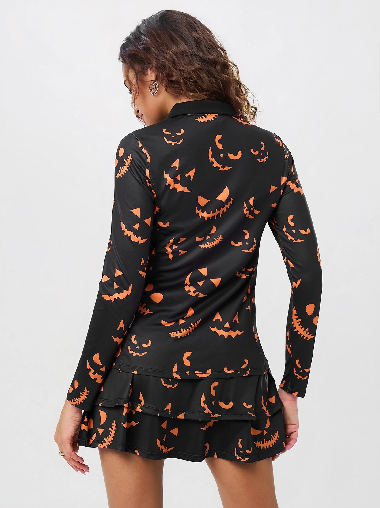 Embrace the Halloween spirit in this playful long-sleeve polo shirt. Featuring a festive Pumpkin Grin Print, this top is perfect for costume parties and seasonal fun. Crafted from a soft, breathable, and stretchy fabric, it keeps you cool and comfortable all day. The 4-way stretch material provides a perfect fit and unrestricted movement, so you can dance or play with ease.