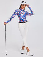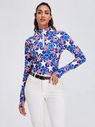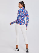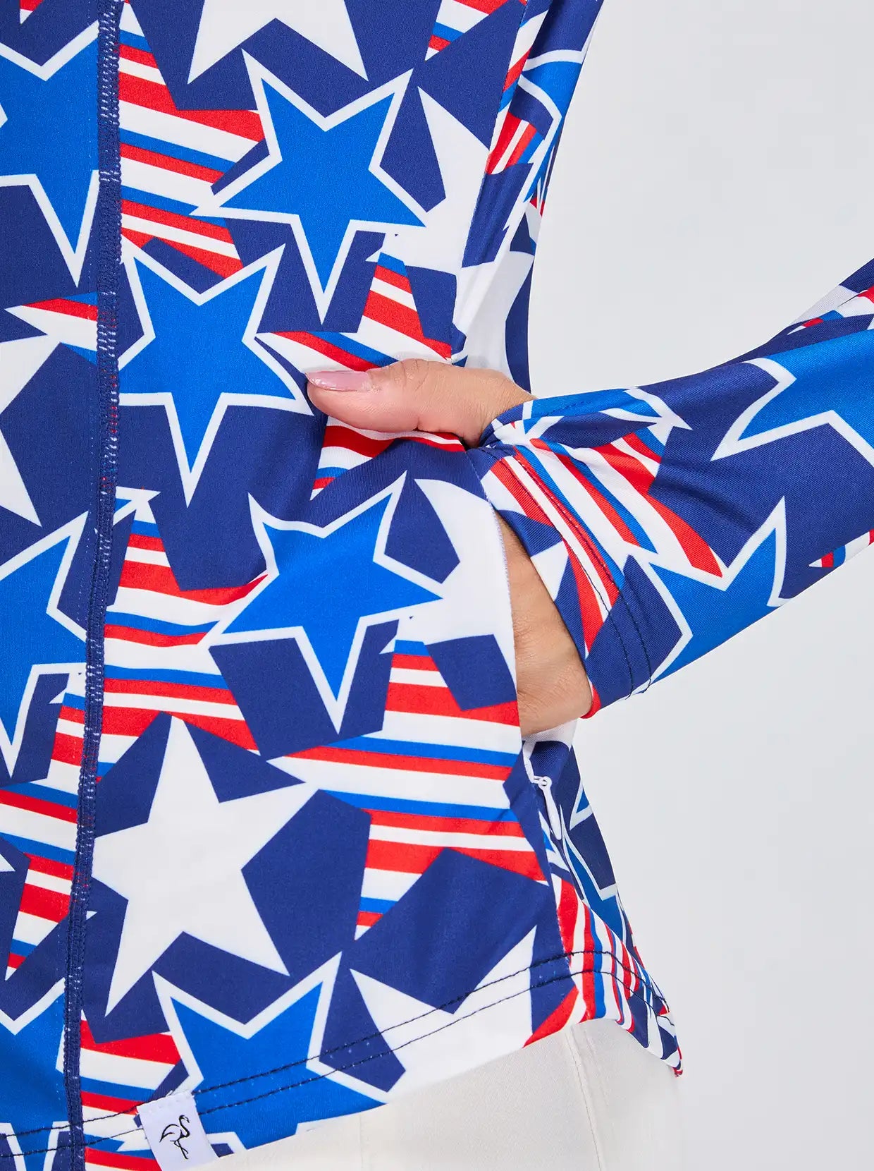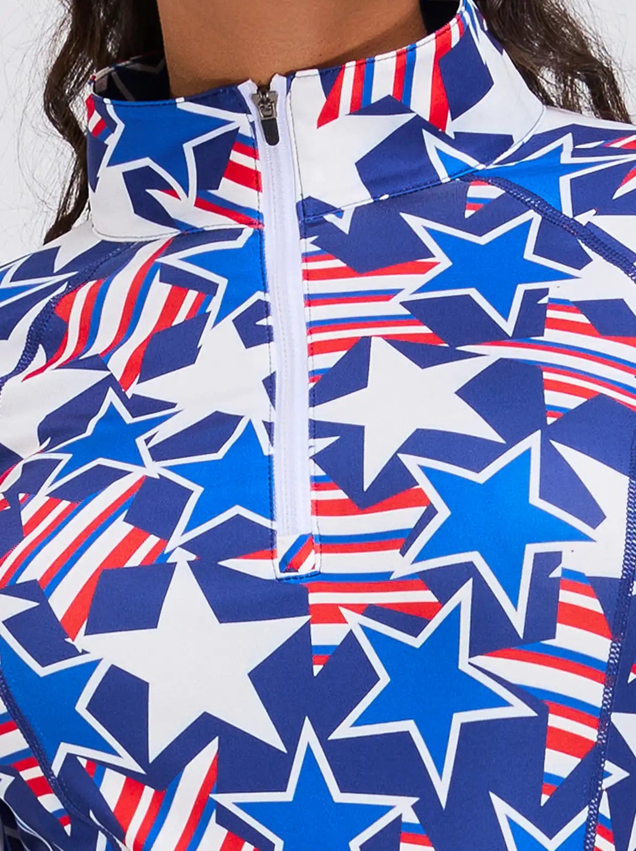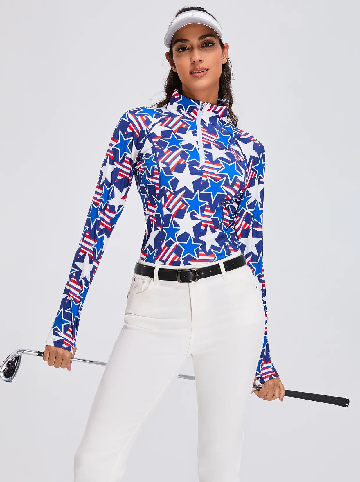 From casual outings to active adventures, our blue star quarter-zip long-sleeve shirt is a good choice. The lightweight, four-way stretch fabric allows for a full range of motion, while the thumbholes, stand-up collar, and quarter-zip design provide added protection. The handy side pockets are perfect for storing your phone, keys, or other small items.