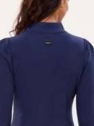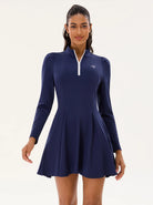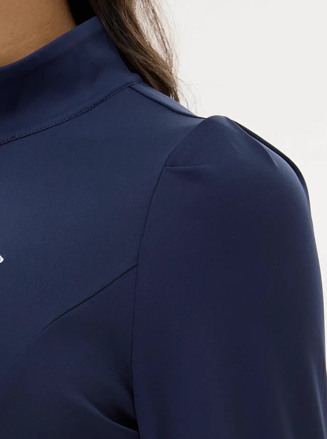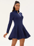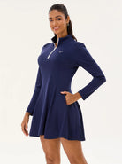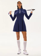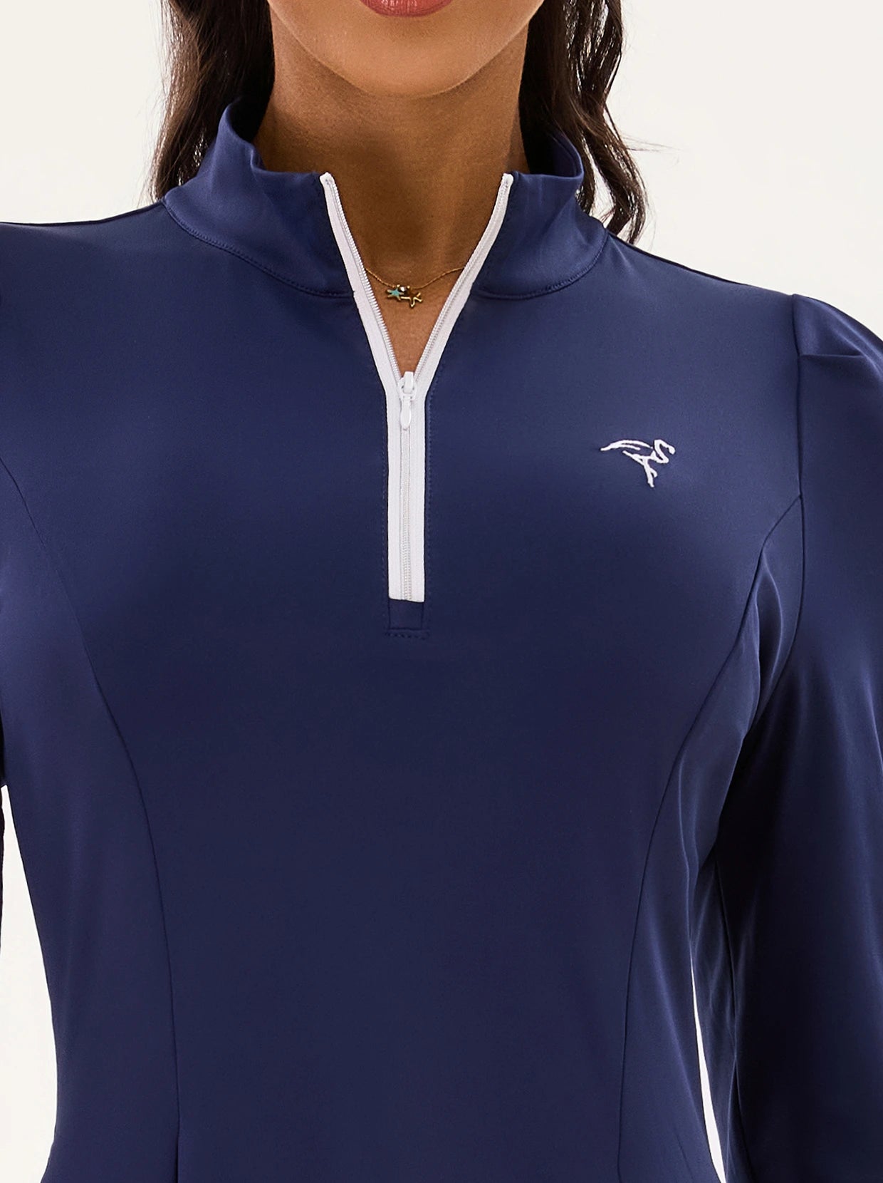 Swing into style with our navy long-sleeve dress that's built for action. Four-way stretch fabric provides the freedom to move without limits, while moisture-wicking keeps you cool and dry. The playful puff shoulder brings personality to your look, and the quarter-zip stand collar lets you dial in comfort on demand.