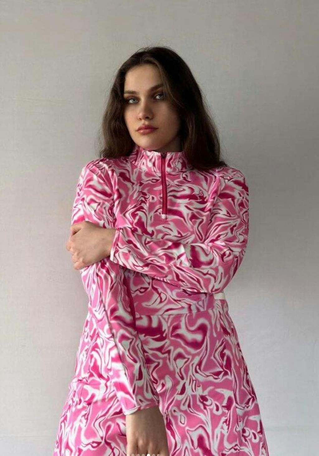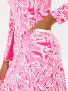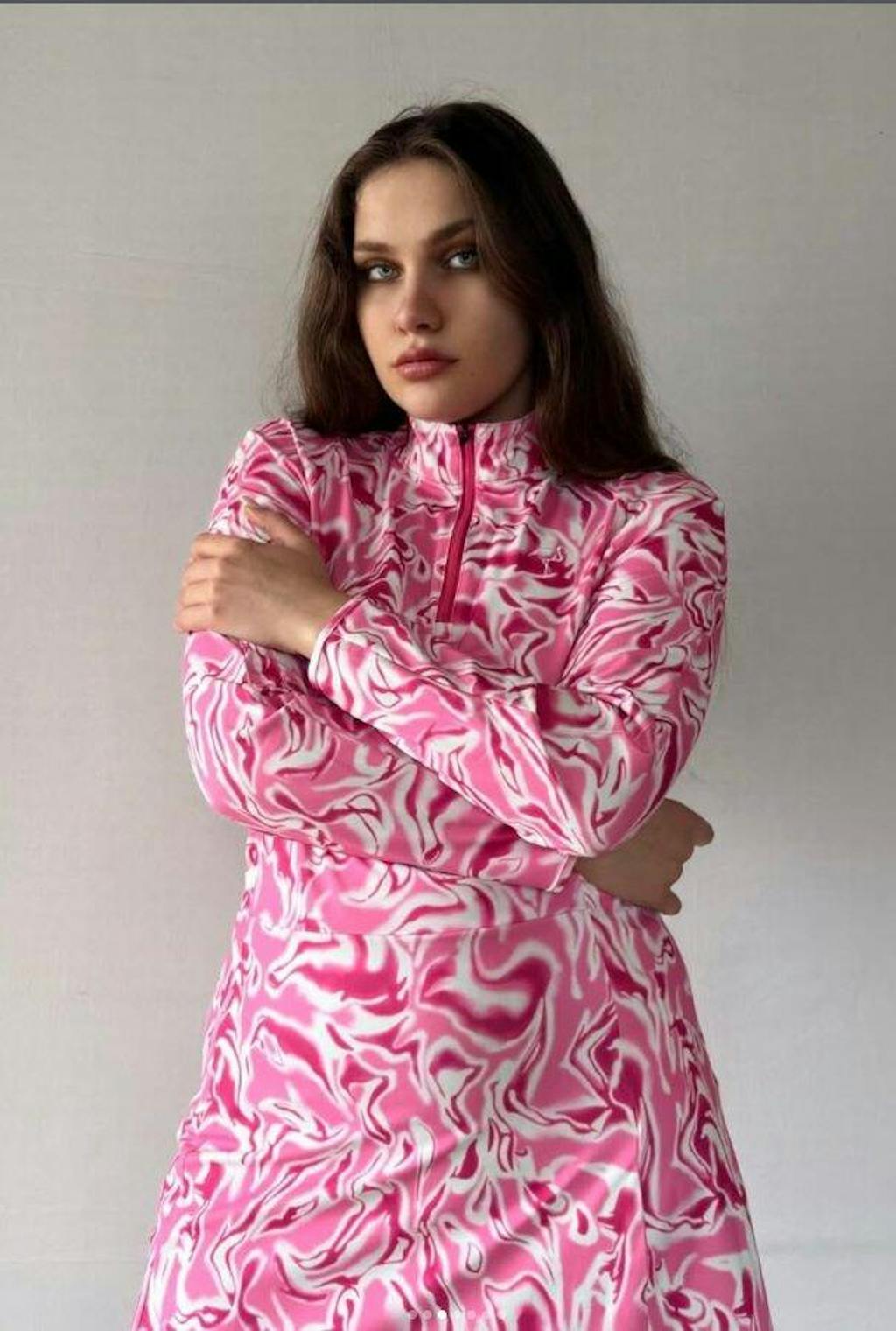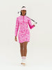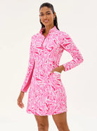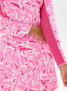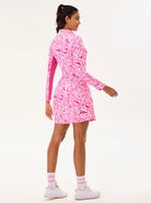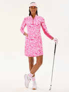 Splash into action with this women's golf dress featuring a captivating pink water ripple design. Half-mesh sleeves deliver breathability and UV protection, while 4-way stretch fabric keeps up with your most dynamic moves. The quarter-zip puts comfort adjustments in your hands, and the fluid print adds an artistic edge to your athletic look. From the golf course to the tennis court to your next pickleball showdown, this dress proves that performance and personality are the perfect pair.