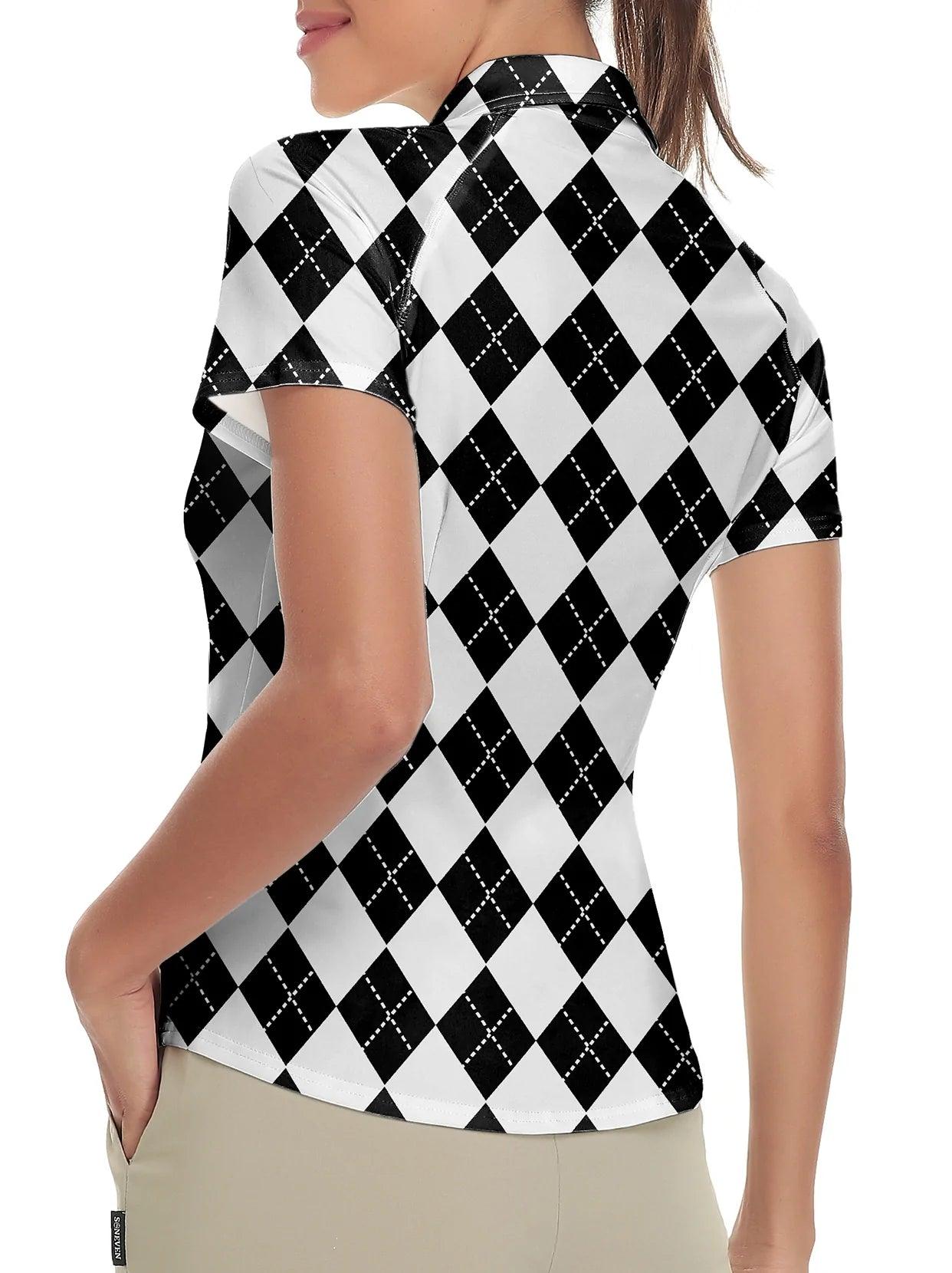 Shop our Ladies' Short Sleeve Golf Polo - Black and Gray Checkboard Golfer's Moisture Wicking Athletic Golf Lapel Quarter Zipper Polo Shirt Tennis Shirt Dry Fit.