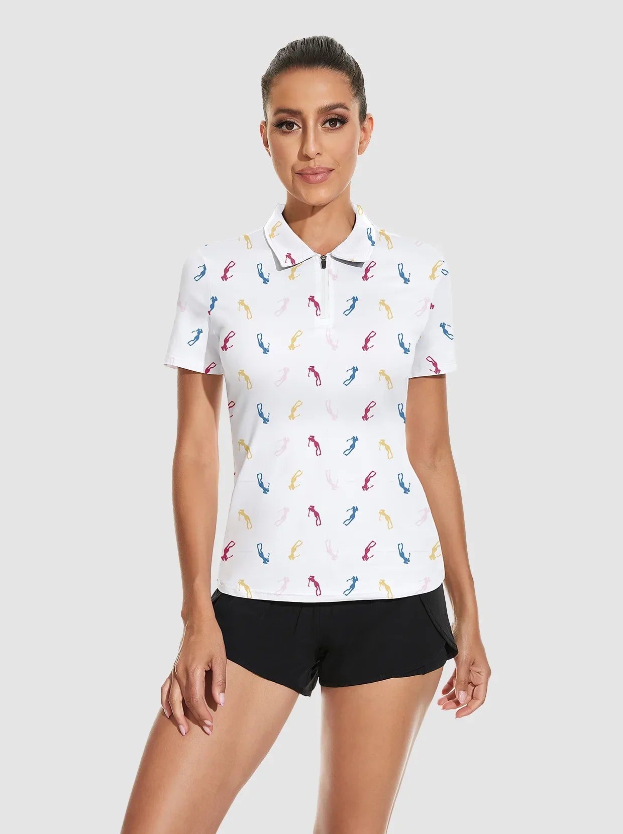 White Golfer Print Athletic Golf Polo Shirt for Women