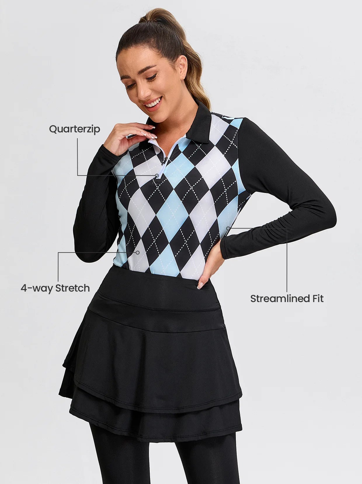 Stay warm and comfortable in our Black and Blue Argyle Quarter-zip Long-Sleeve Fleece Top. Crafted with a lining fleece and soft fabric, our polo shirt offers maximum warmth and comfort. With a quarter-zip and stretch fabric, this top offers a personalized fit that conforms to your body for all-day comfort and flexibility. Perfect for outdoor activities.