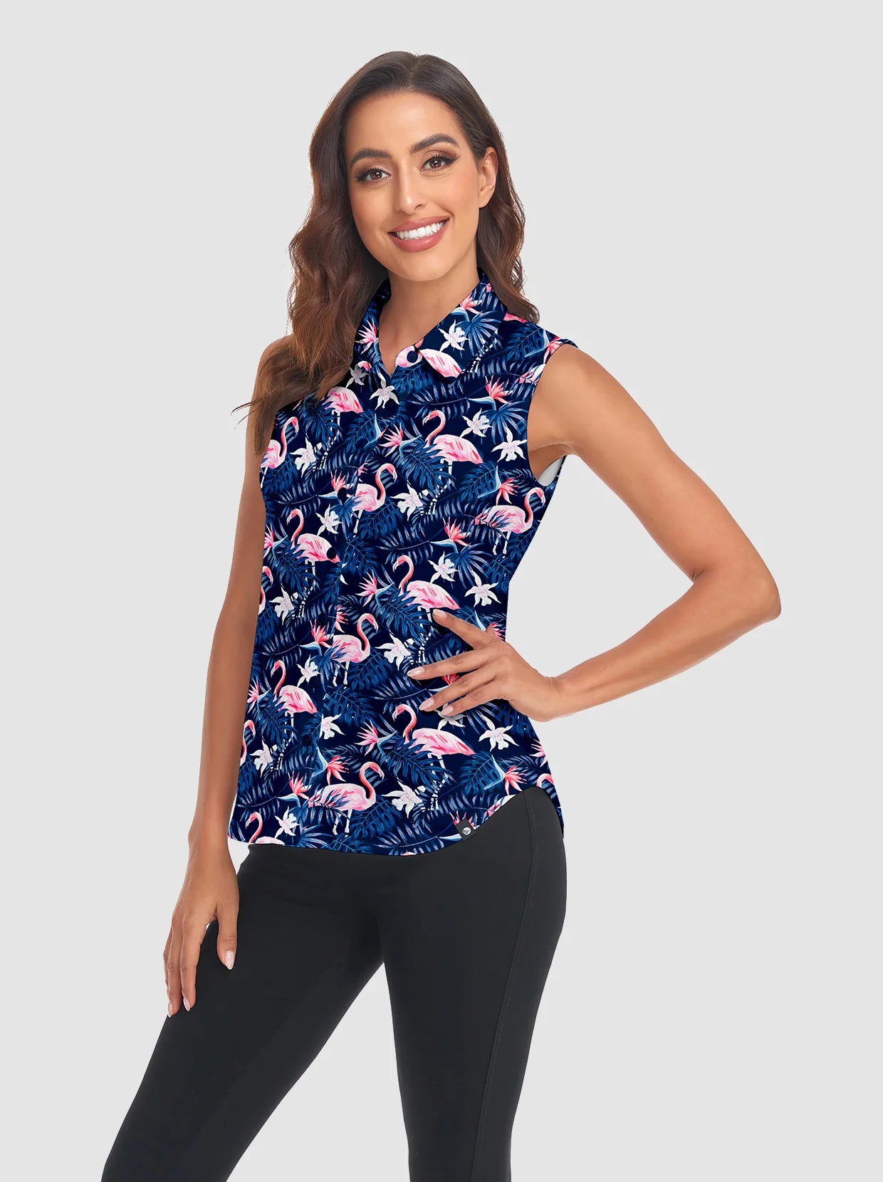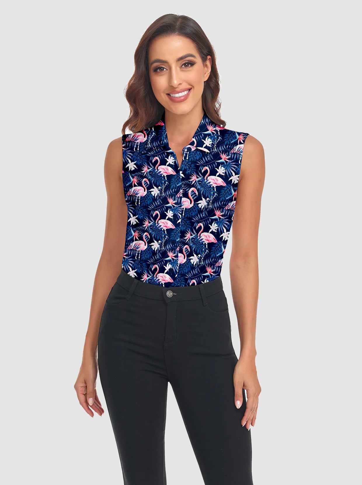 Stand out on the green with our Flamingo Sleeveless Golf Polo. This shirt features vibrant flamingo and palm prints. The button-down design makes it versatile on-course and off-course. The sleeveless style adds a fashionable vibe to your sports wardrobe. Perfect for parties and club activities after afternoon golf rounds.