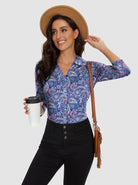Blue Paisley V-Neck Button Down 3/4 Sleeve Shirt for Women