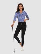 Express your unique style and stay comfortable on the course or during office hours with the Blue Paisley V-Neck Button Down 3/4 Sleeve Shirt for Women. Made with UPF50+ material and featuring a streamlined fit, this shirt ensures protection from harmful UV rays while offering flexible movement. The vibrant print and elegant button-down collar add a touch of sophistication to your wardrobe. Perfect for both golf and office environments, this versatile piece is a must-have for any stylish and practical woman.
