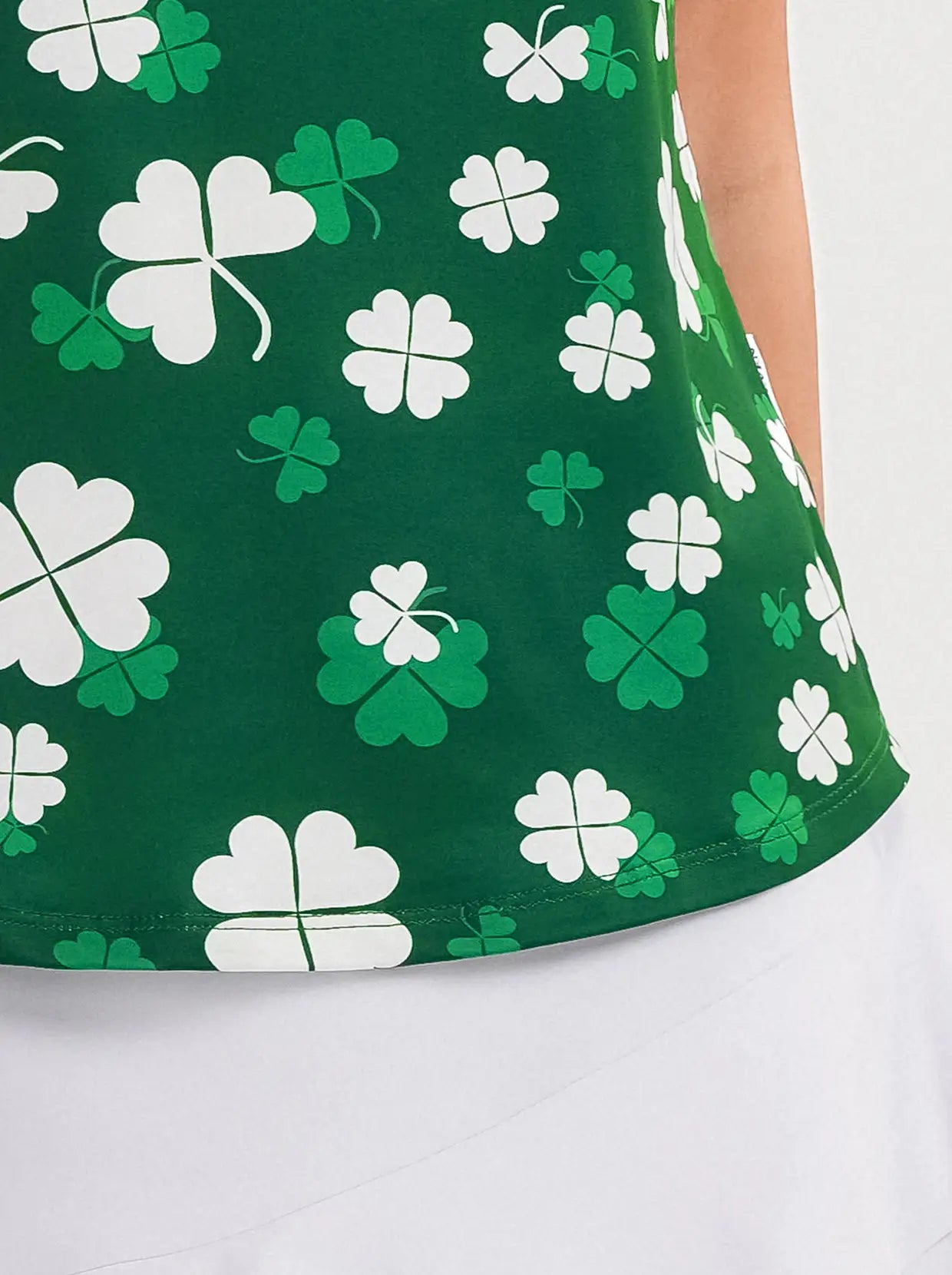 Stay comfortable and fashionable all day with our White Floral Quarter-zip Short-sleeve Polo Shirt for Women. Crafted from quick-drying fabric, it effortlessly wicks away moisture and dries fast, making it ideal for outdoor adventures. The stretchy material and curved hem provide freedom of movement, while the quarter-zip design offers convenience in dressing and a comfortable fit. And don't forget the playful Shamrock and Clover print on a green backdrop that adds a touch of personality to your wardrobe.