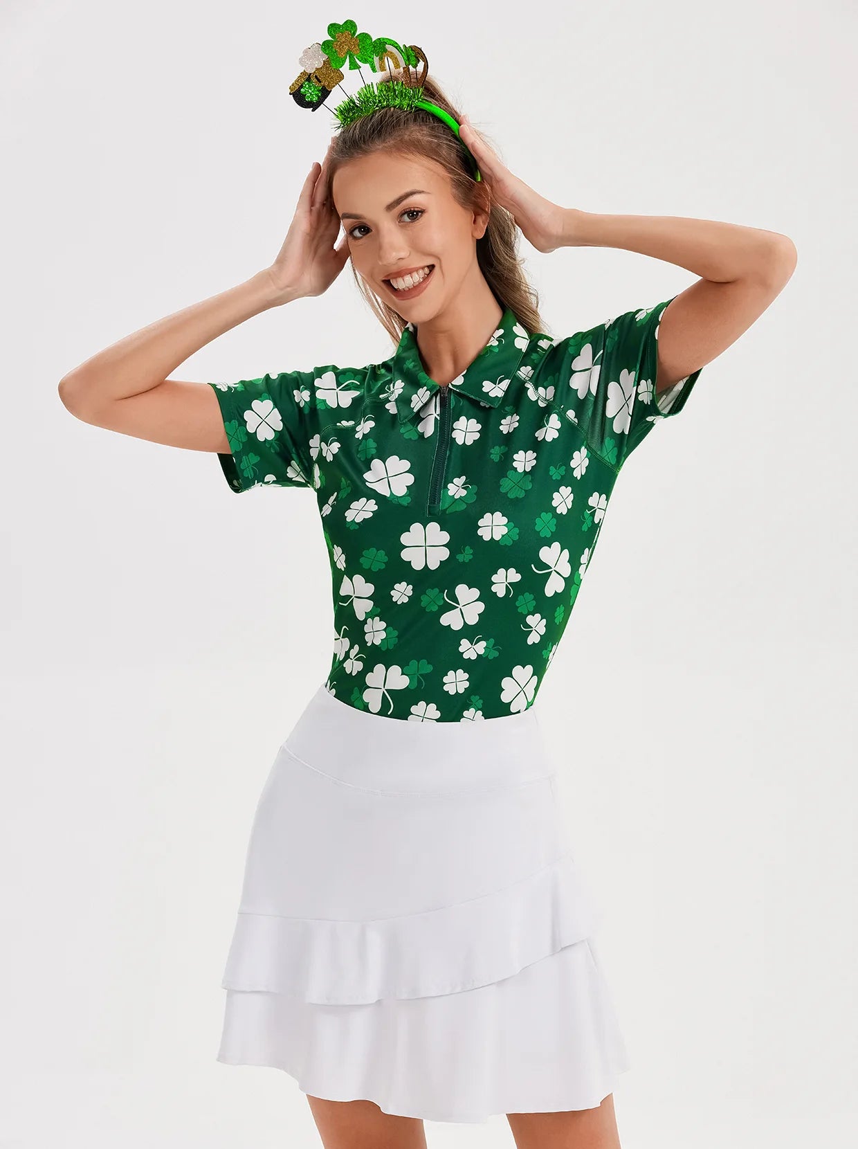 White Shamrock Quarter-zip Short-sleeve Polo Shirt for Women