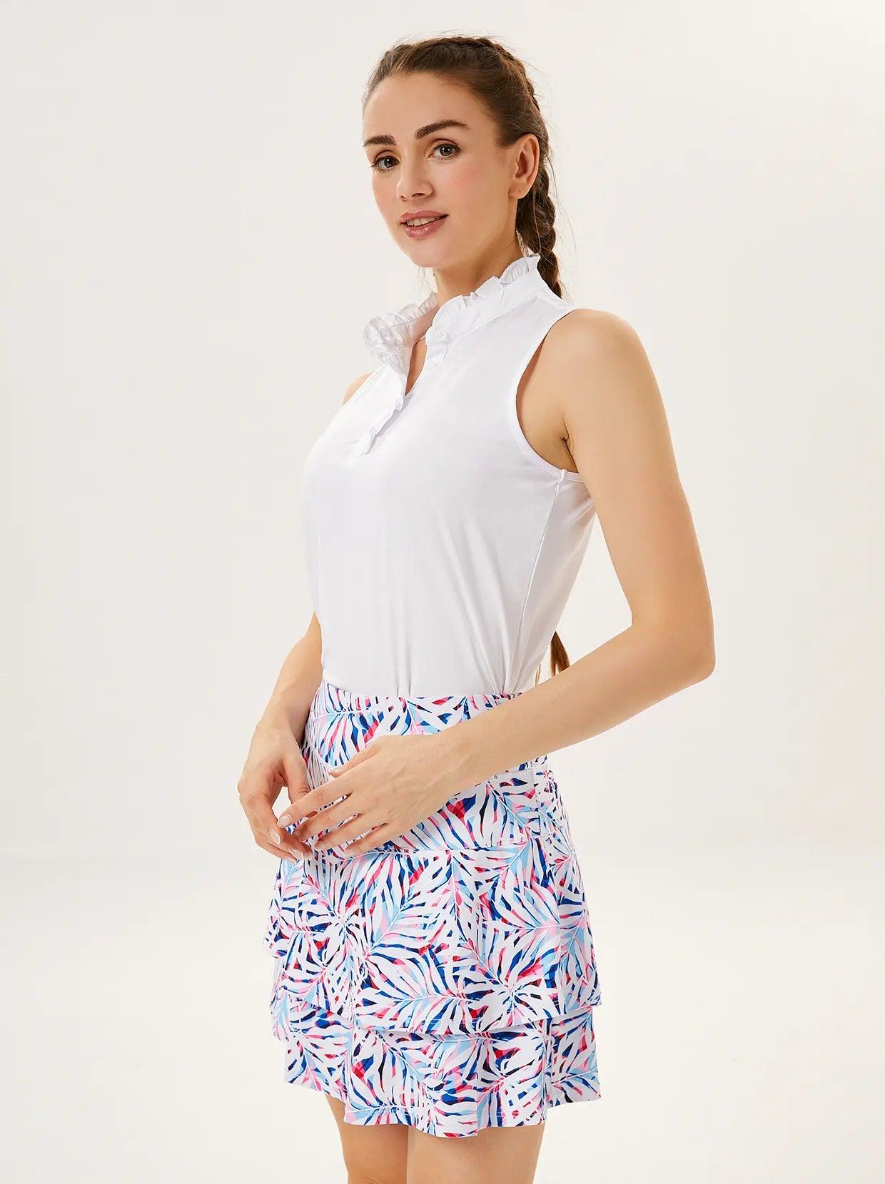 Stay cool and elegant with our sleeveless ruffle collar polo shirt. Crafted from soft, stretchy, and moisture-wicking fabric, this shirt keeps you cool and dry on the course. The ruffle collar and button placket add a touch of elegance, while the versatile design transitions seamlessly from the green to the office. Enjoy ultimate comfort and performance with every swing.