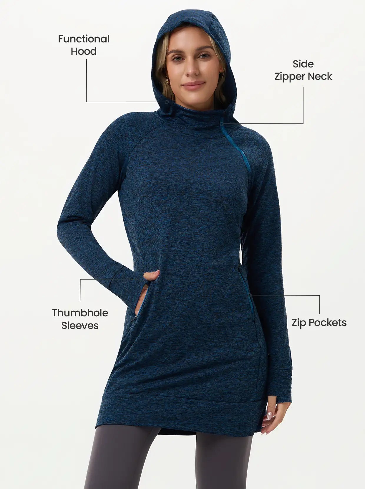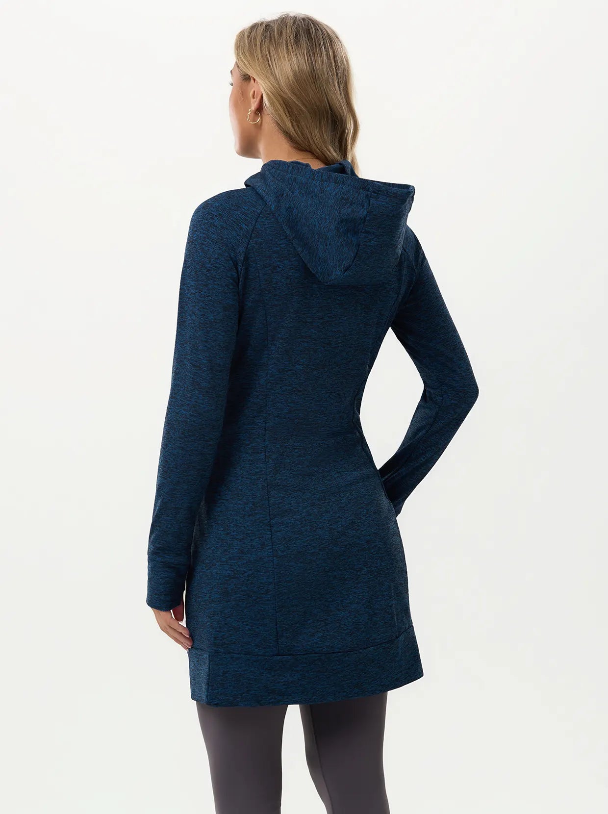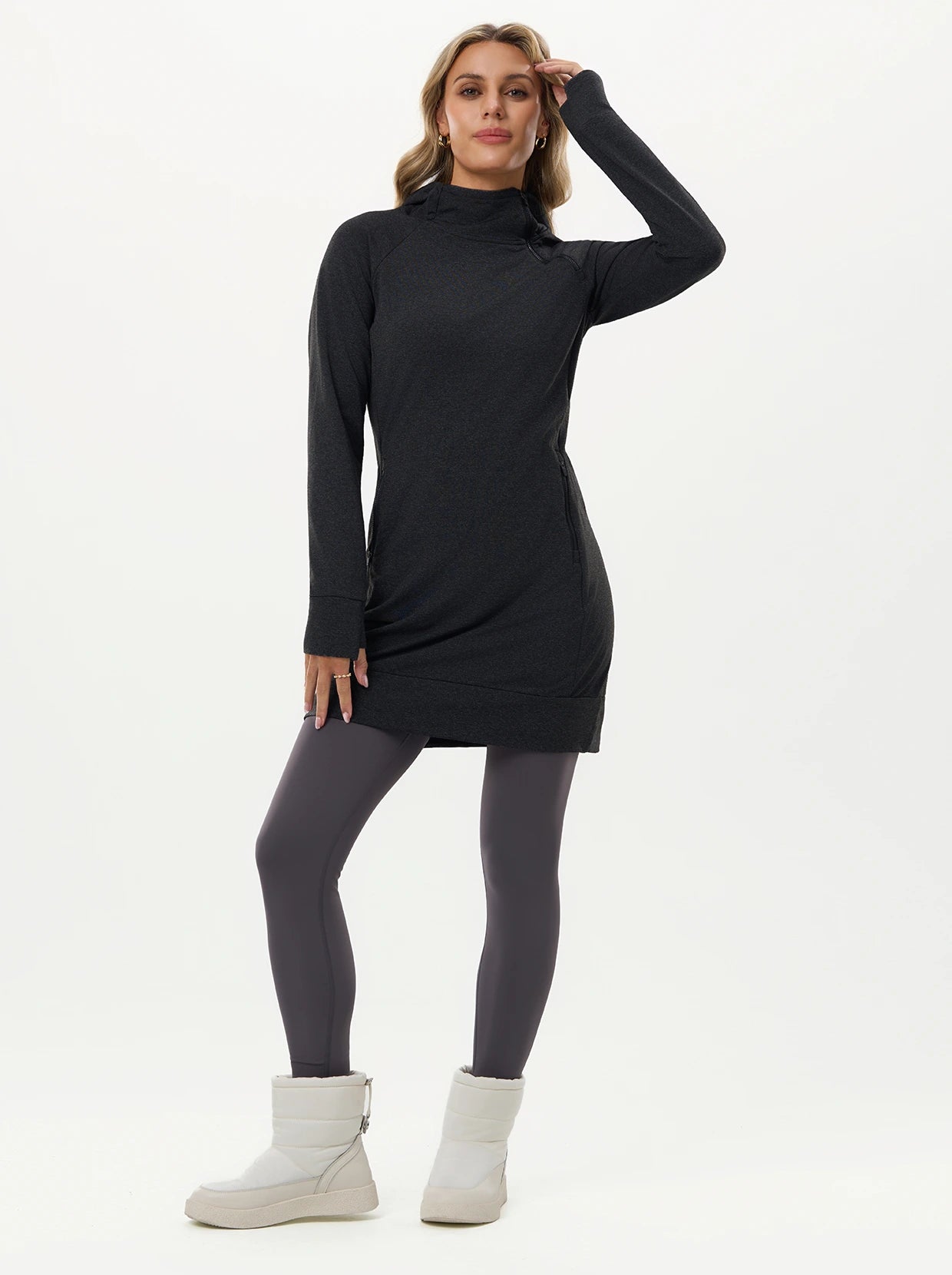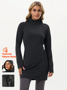 Move through your day in this thermal hooded dress that’s built for comfort and function. The cozy fleece lining provides powerful, lightweight warmth, ensuring the chill stays out. Stretchy, skin-friendly fabric guarantees total freedom of movement, and the thumbhole sleeves offer extra coverage and comfort for your hands.