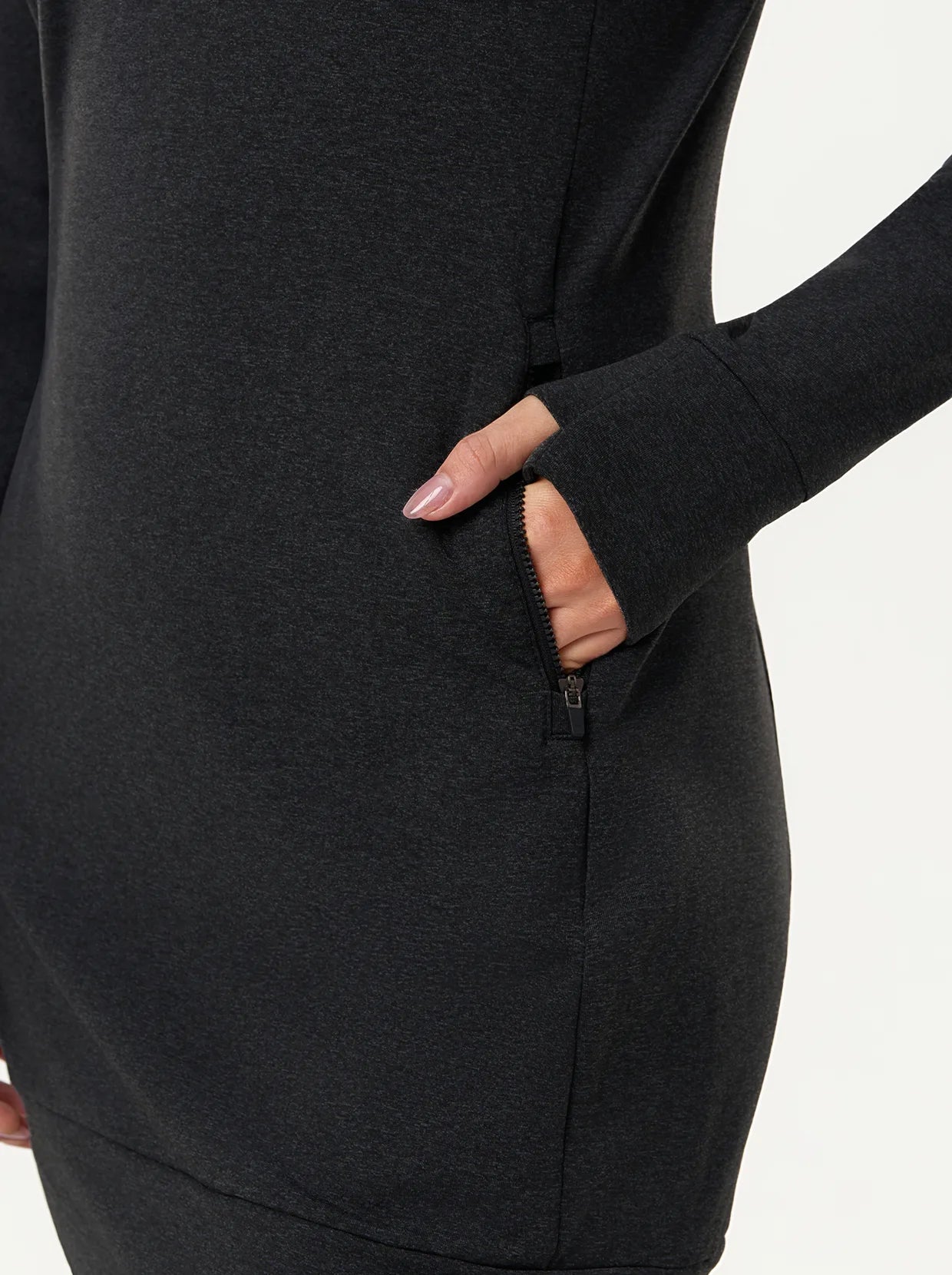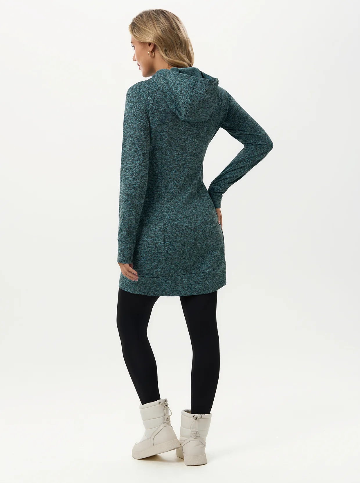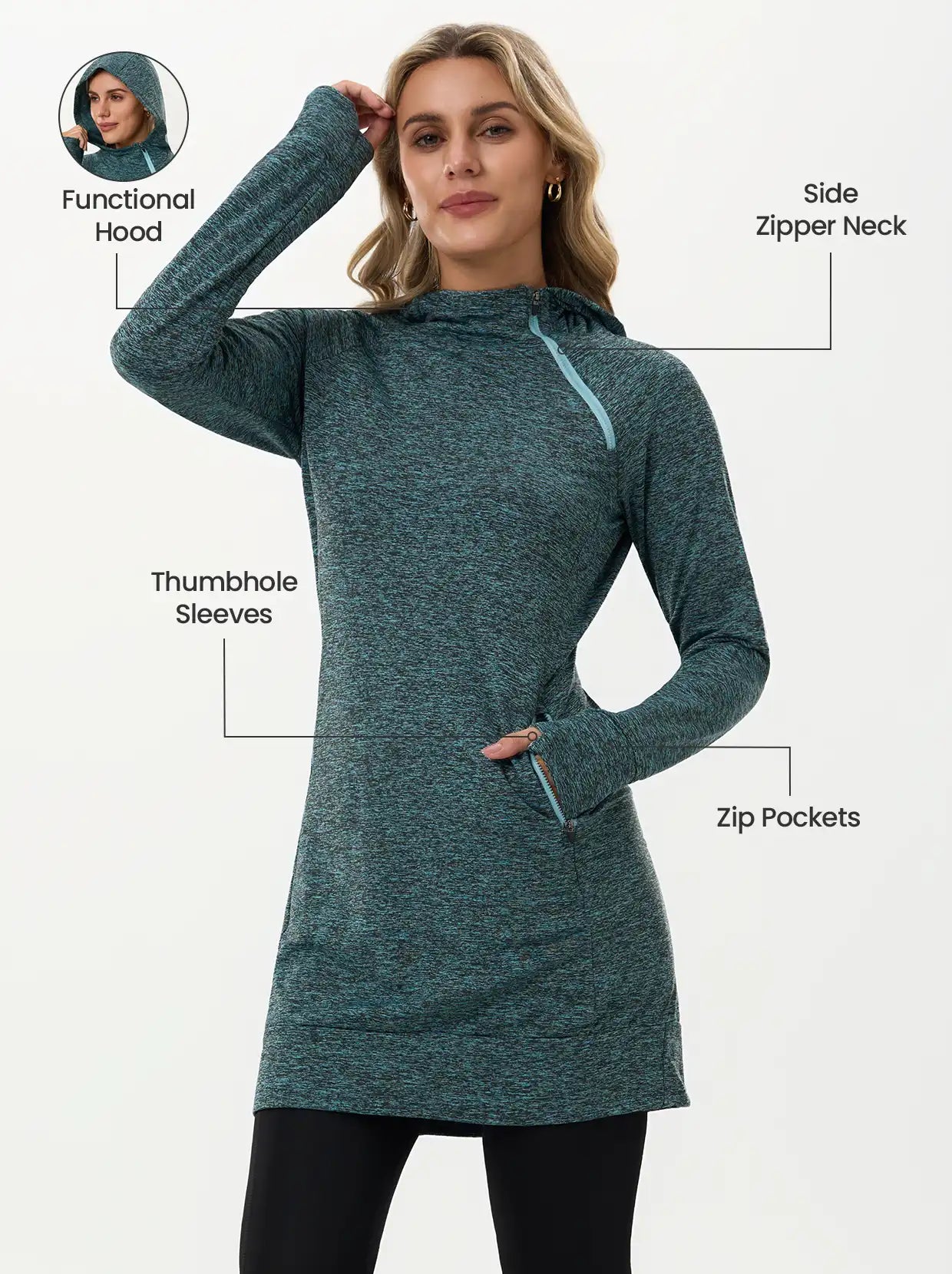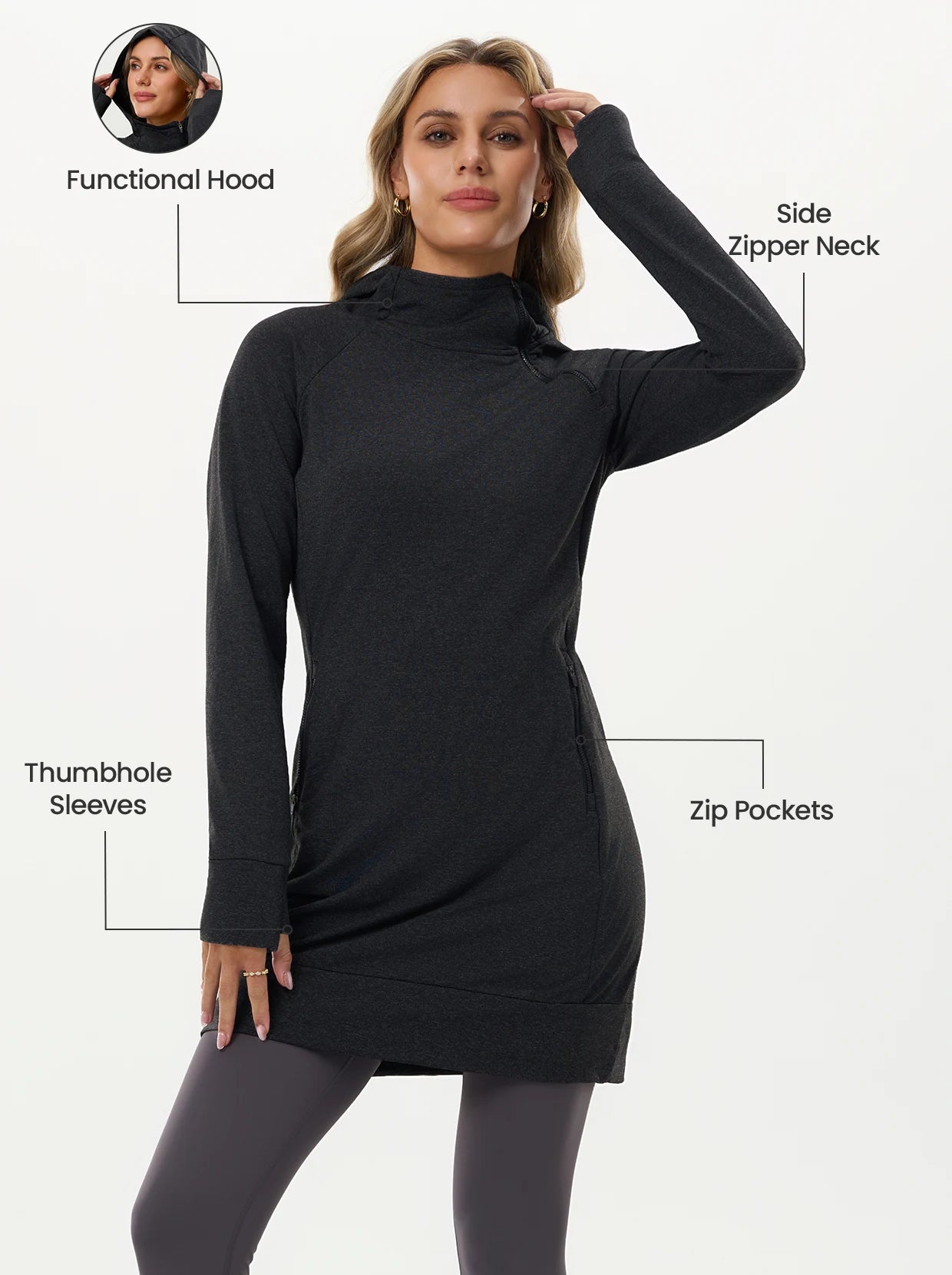 Move through your day in this thermal hooded dress that’s built for comfort and function. The cozy fleece lining provides powerful, lightweight warmth, ensuring the chill stays out. Stretchy, skin-friendly fabric guarantees total freedom of movement, and the thumbhole sleeves offer extra coverage and comfort for your hands.