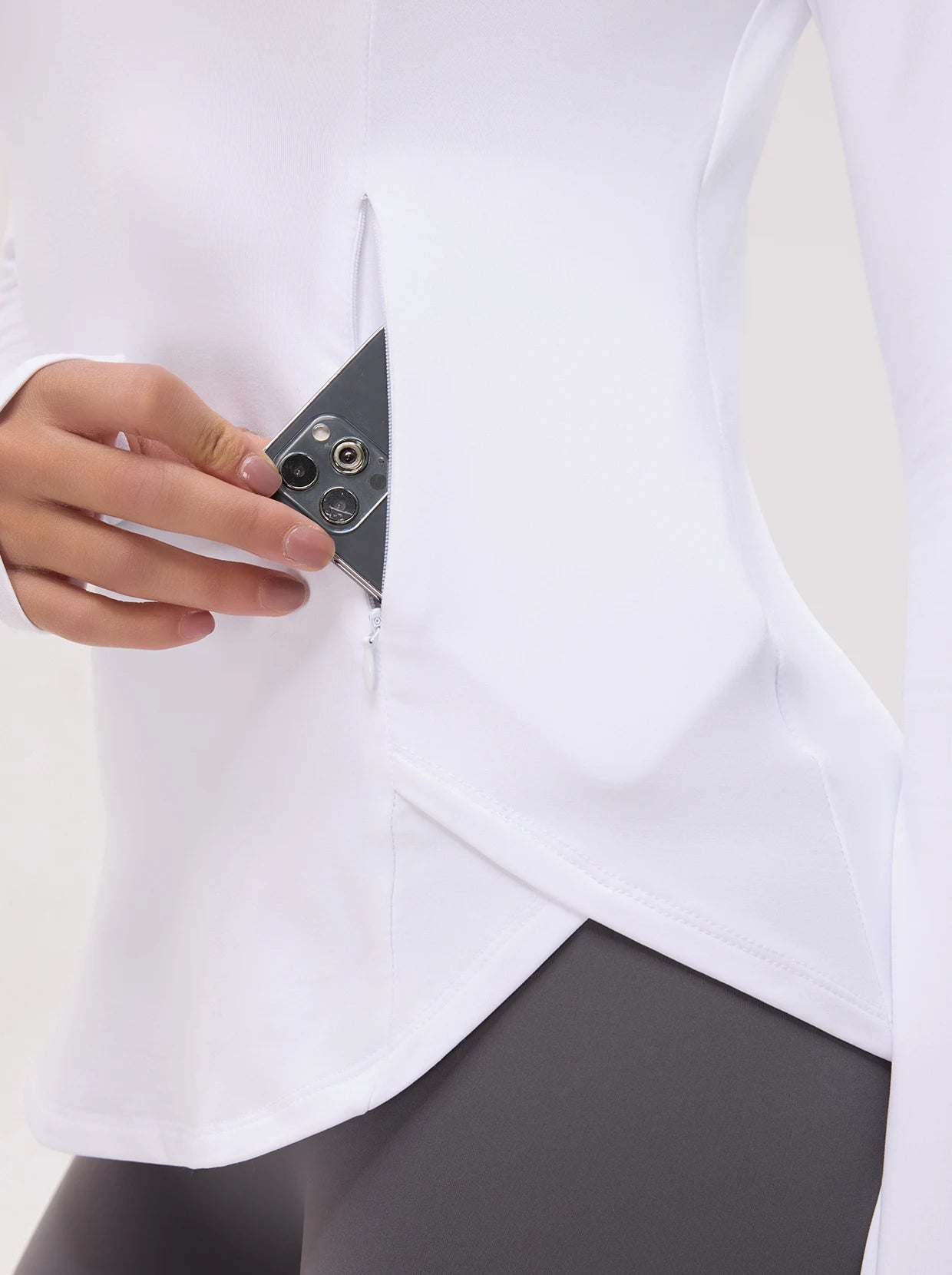 Highlights: UPF50+ (UVA/UVB), streamlined fit, thumbholes, pocket, curved hem